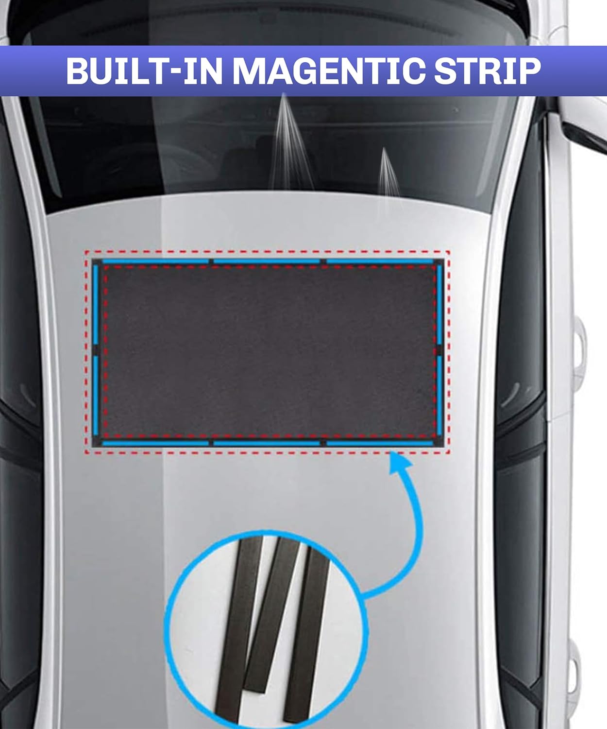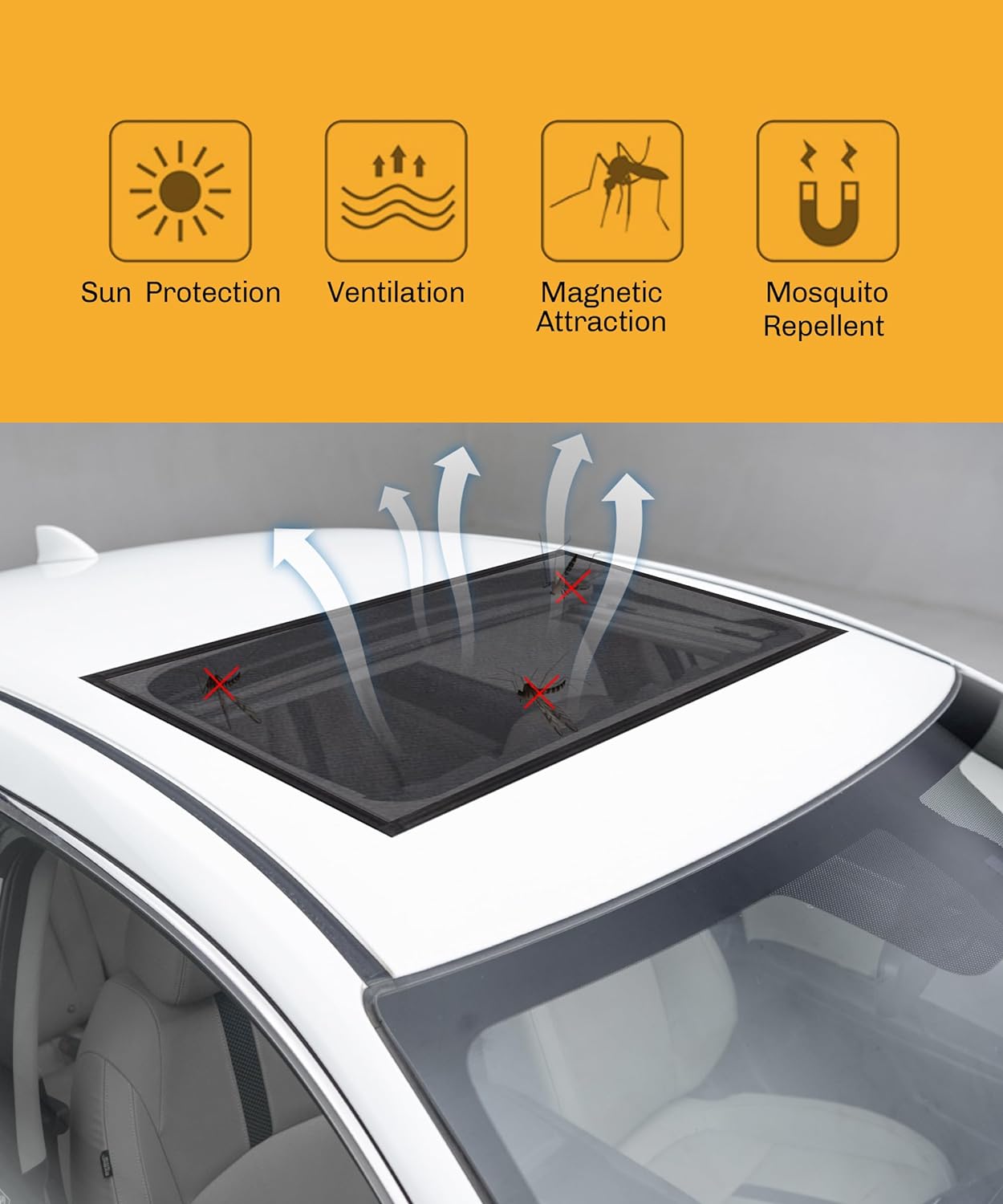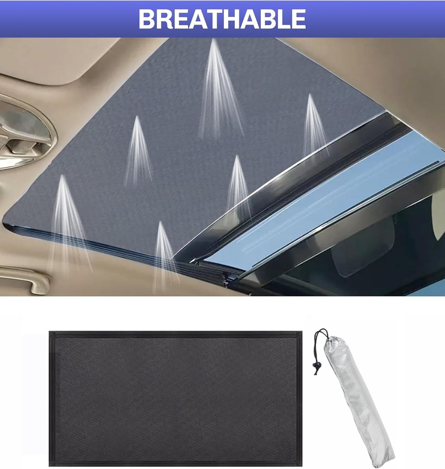 [High Quality Materials]This car sunroof sunshade is made of mesh and soft magnetic material, which is 100% safe for children, breathable, durable, and has a long service life.[Comprehensive Sunscreen] Black mesh fabric can reflect sunlight to the maximum extent, block harmful ultraviolet rays, rays, and glare, effectively reduce the temperature of the car in the scorching summer, and prevent your child and family from being exposed to strong light, high temperature, and harmful sunlight. Sunshade car accessories are essential for long-distance travel.[Easy to Use] Quickly install, unfold, and cover in 10 seconds: 1. Unfold the sunshade magnetic mesh. 2. Cover it on the roof of the car. Magnetic stripe stitching can be well adhered to the iron roof.[Easy to Store] The car sunroof sunshade is easy to store. When not in use, it can be placed in the luggage compartment of the storage bag received as a gift, easy to carry, and convenient for you to use at any time. The sunroof sunshade will provide you with day and night protection, and provide you with a comfortable car environment when parking or camping.[Widely Applicable] Our sunroof sunshade has a size of 39.3 inches x 23.6 inches, suitable for most cars, SUVs, MPVs, and other types of iron roofs. Please check the size of your roof before purchasing.