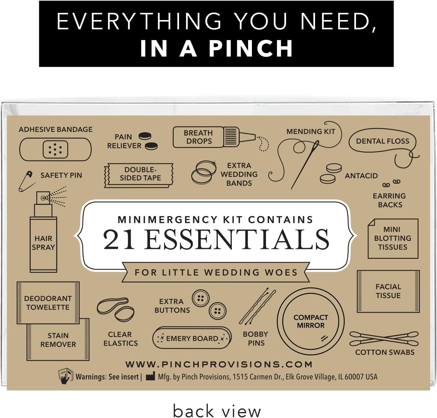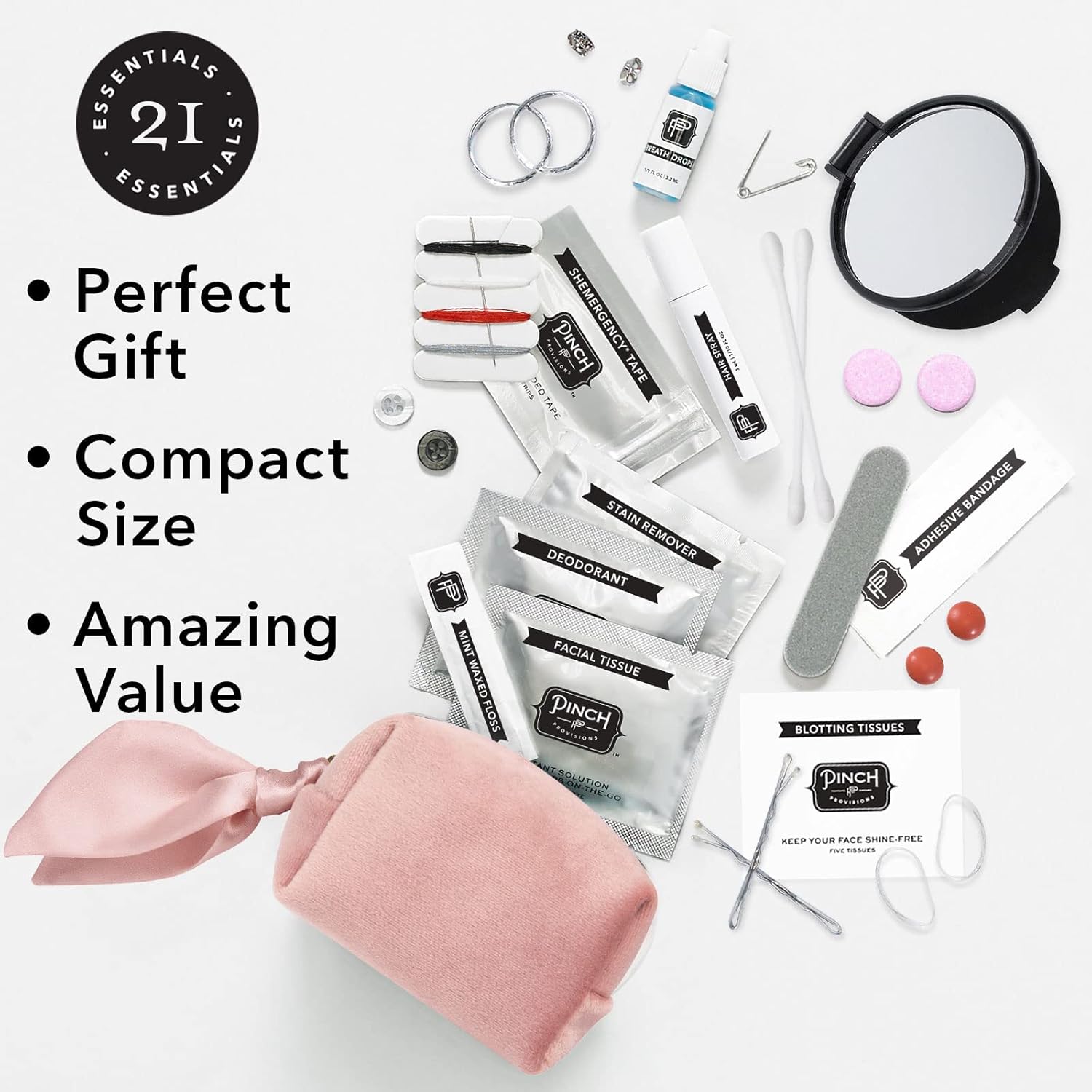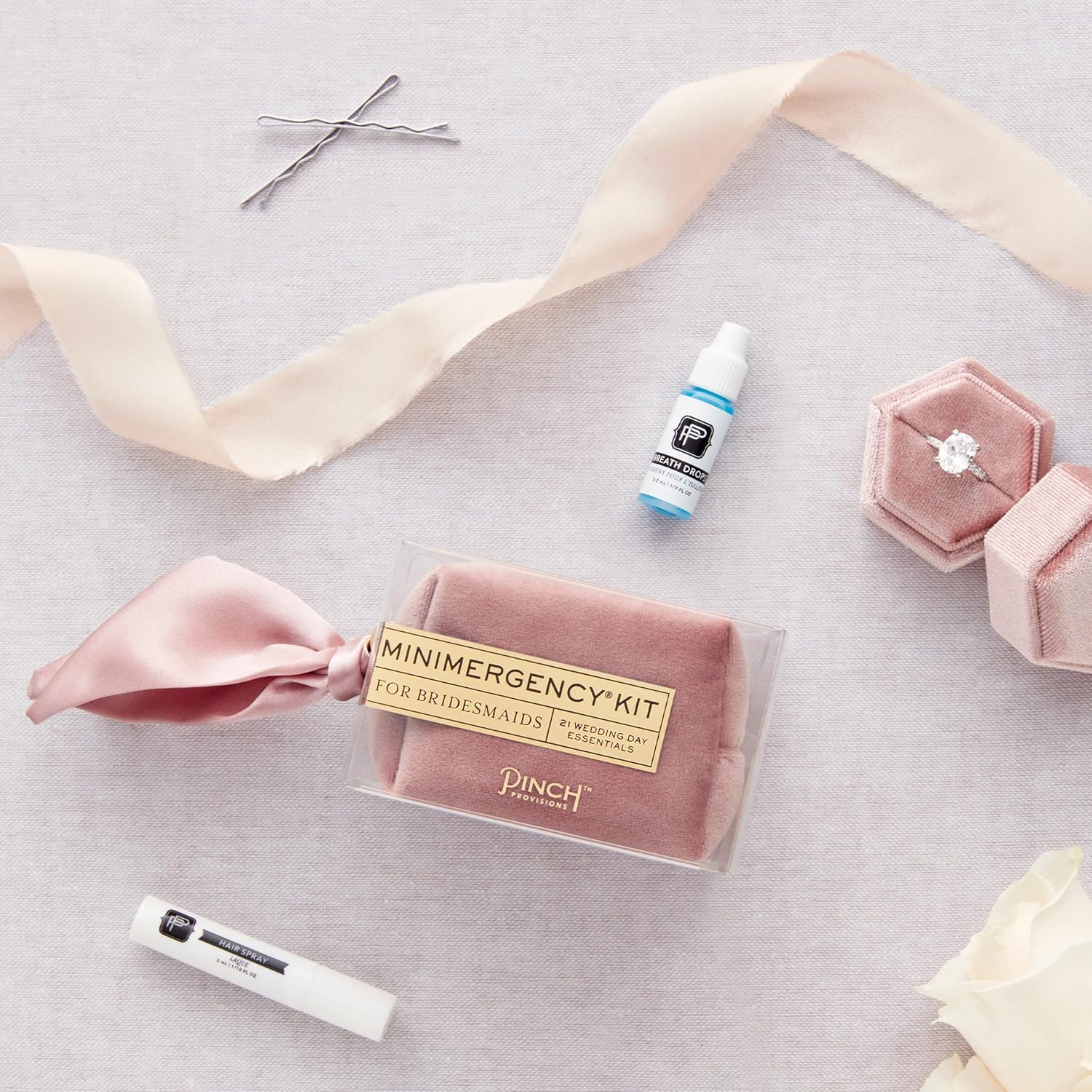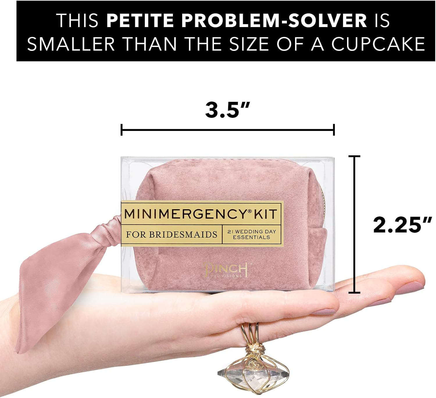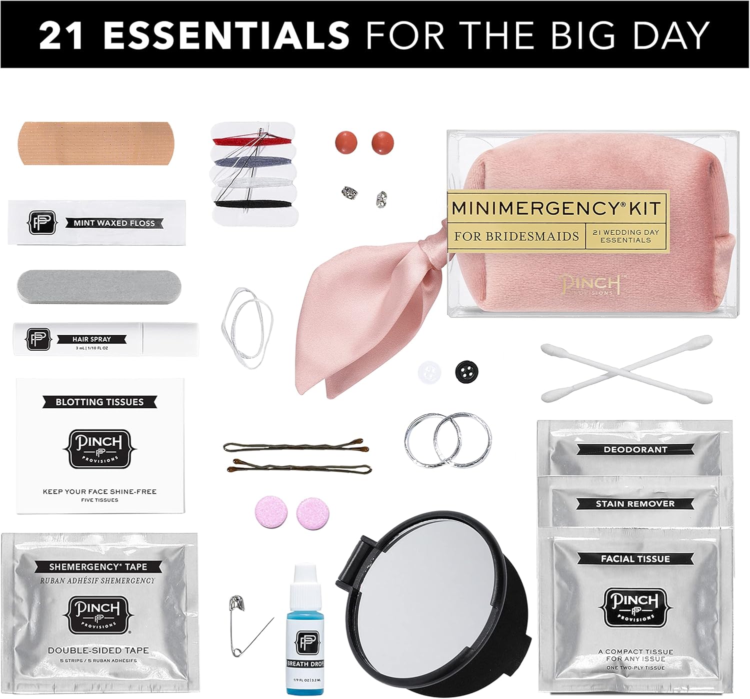 BRIDESMAID’S SURVIVAL KIT TO THE RESCUE: Save the big day with an authentic Pinch Minimergency Kit for a Bridesmaids, designed to tackle any last minute mishaps. With an assortment of 21 must-have items in a chic zipper pouch, stay a step ahead on the wedding day and beyond!
