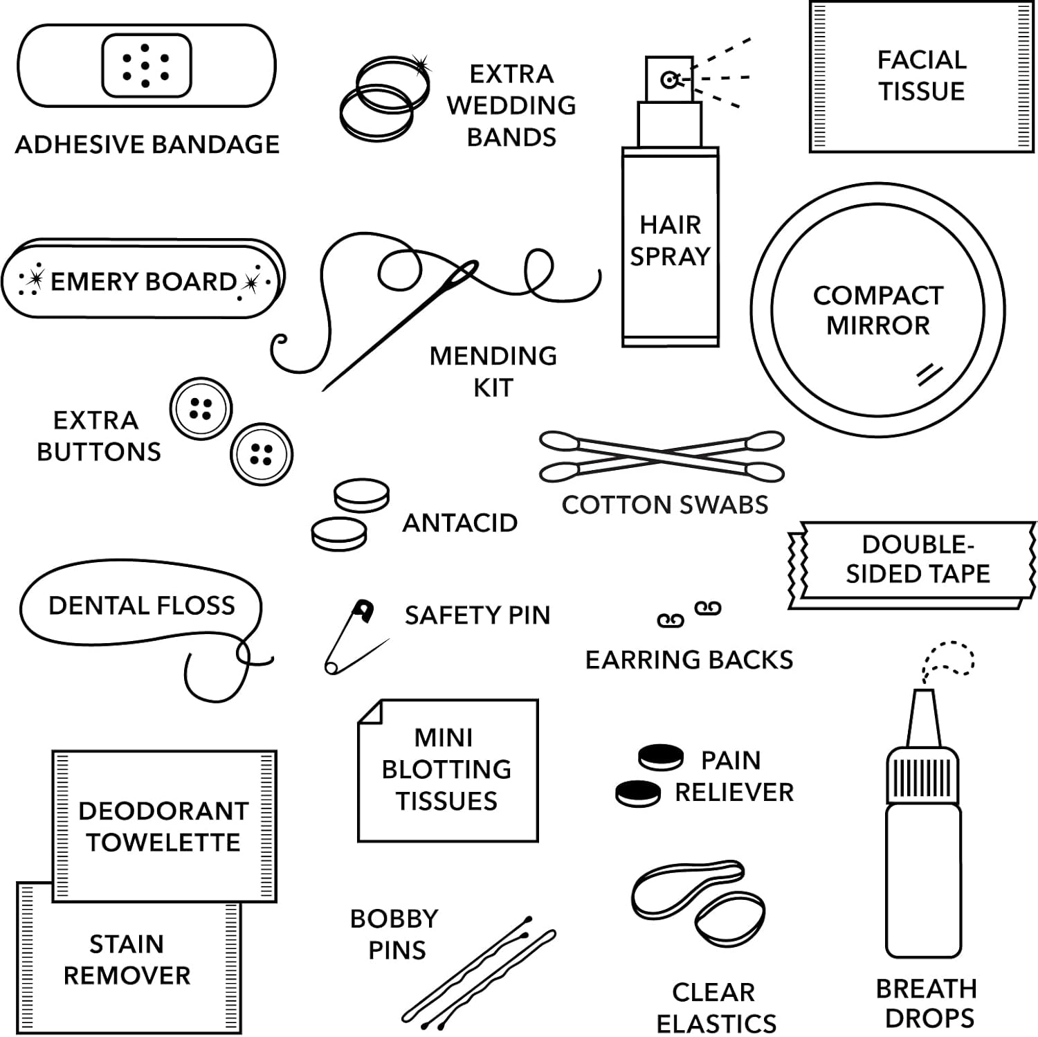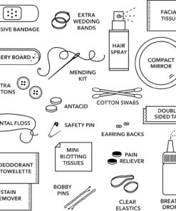ALL-IN-ONE EMERGENCY KIT FOR THE BIG DAY: This kit is chock-full of the most practical and well-curated beauty, fashion, and first aid items like hairspray, stain remover, hair elastics, mending kit, safety pin, dental floss, bandage, bobby pins, pain reliever, antacid, and more.