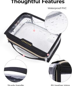 Clear PVC Fabric with PU Leather Trims: The clear makeup bag is made of thick PVC Fabric, which is easy to clean and waterproof. PU leather trims design can maintain the shape of the travel toiletry bag. Leather is sturdy and scratch-resistant, ensuring long-lasting use.