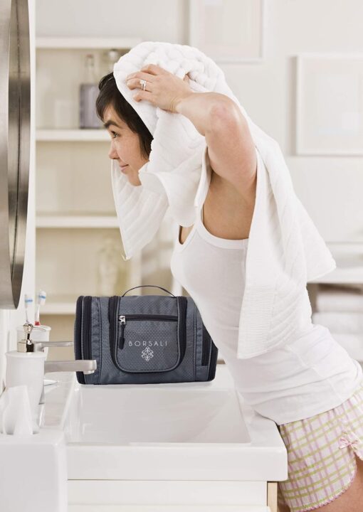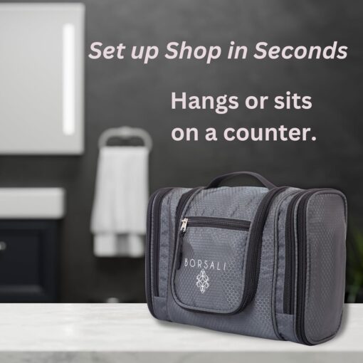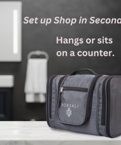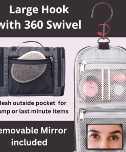 Set up shop in seconds: Wherever you are; in a hotel room; an RV; a tent or your tiny home; this compact yet roomy toiletries bag goes with you and keeps your lotions; makeup; shaving needs all at your fingertips whether you hang it from the sturdy swivel hook or set it upright on the counter