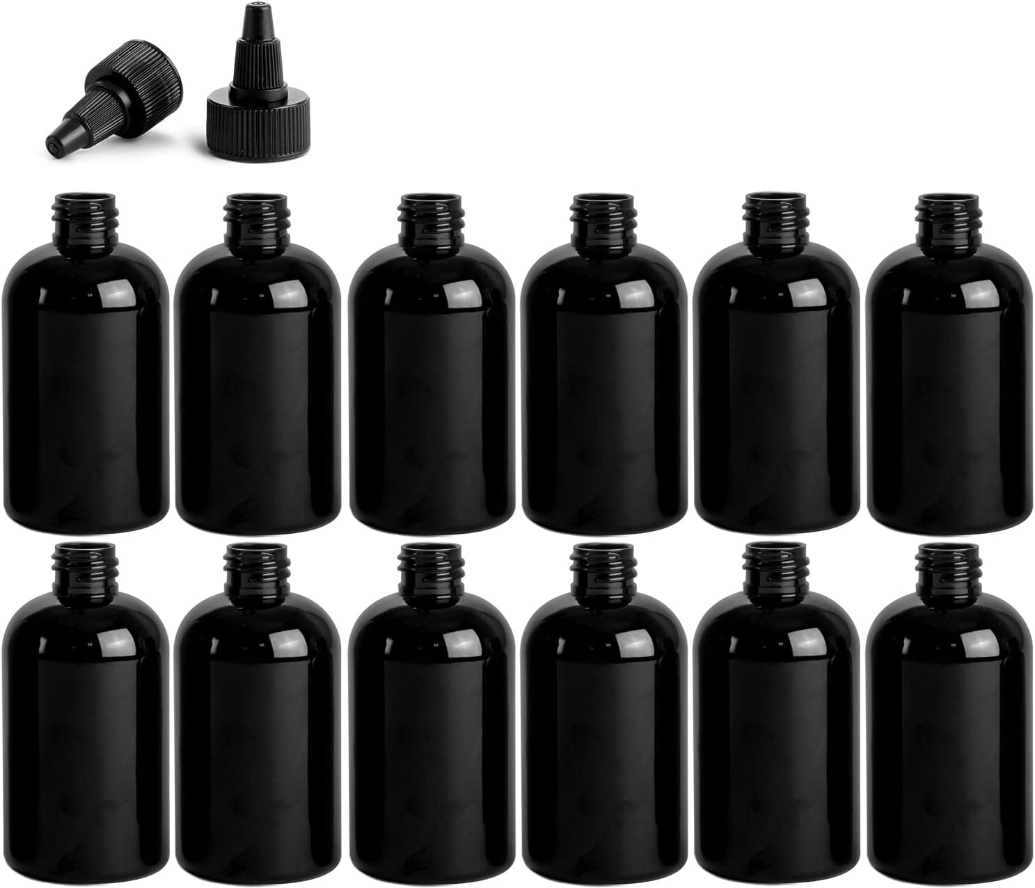Pack of 12 empty, fillable bottles with 12 black twist top caps. Boston Round shaped bottles are made of BPA-free PET plastic.