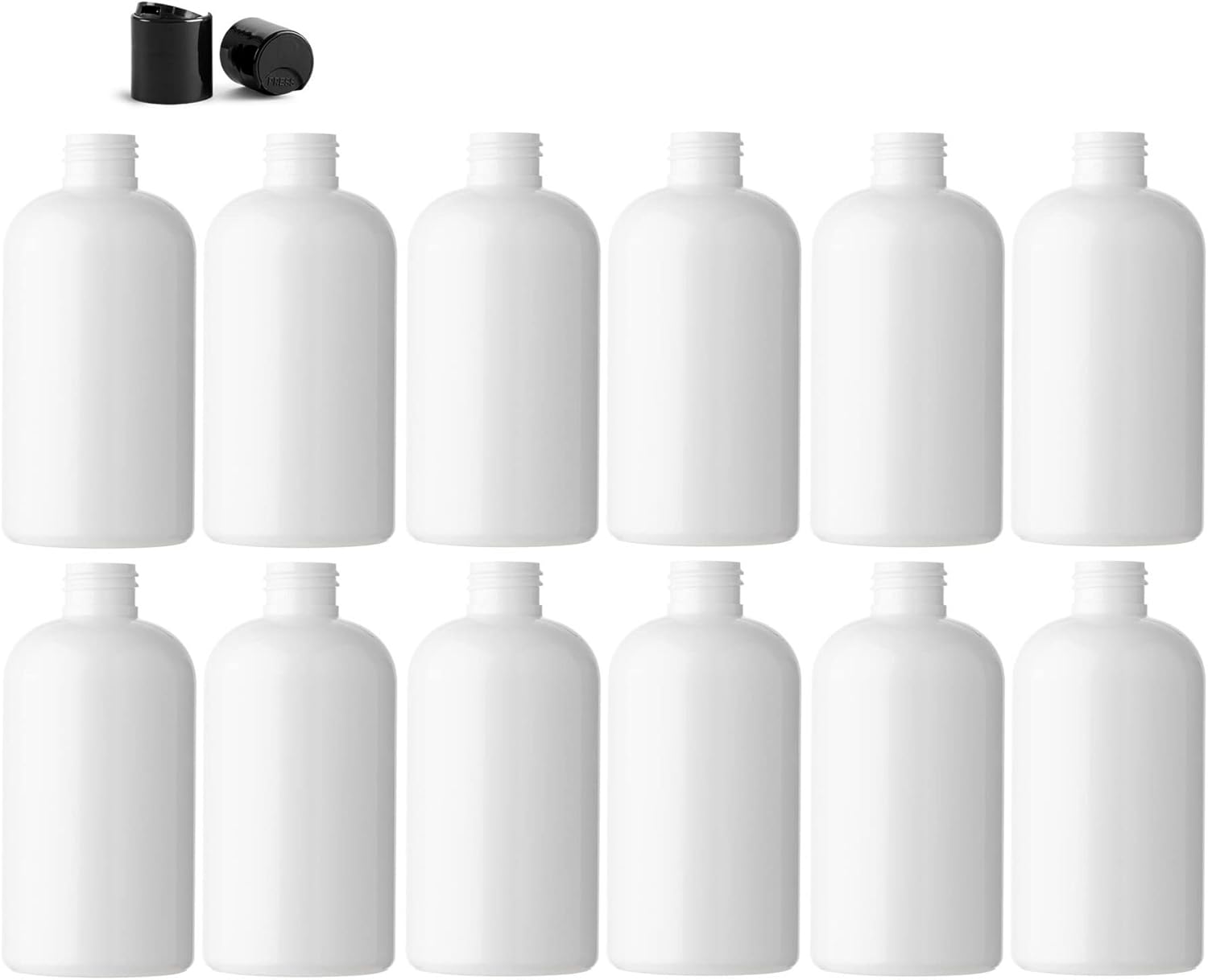 8 Ounce Boston Round Bottles, PET Plastic Empty Fillable BPA-Free, with Black Press Down Disc Caps (Pack of 12) (White)