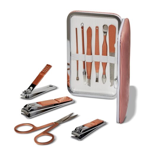 Essential for daily nail care, our elegant 10-piece mani-pedi tool kit will up your self-care game to an 11. Encased in a pretty hard-shelled Blossom blush pink keepsake. Lightweight. Great looking. Contains everything you’ll need to keep your hands and feet beautiful. Made of high-quality materials built to last. Nail Kit includes nail clippers, nail scissors, cuticle trimmer, tweezers, nail file, push stick, and more.