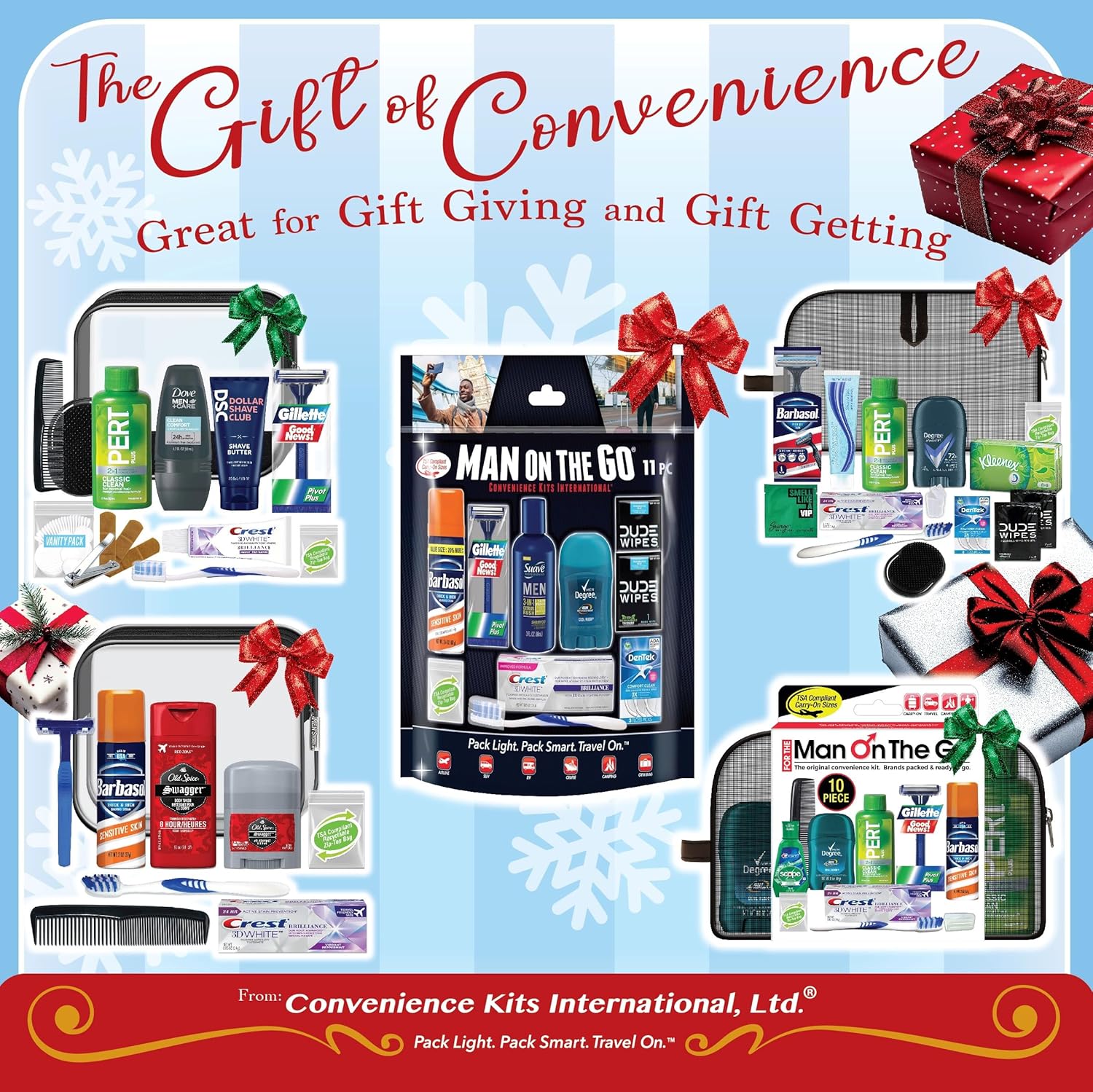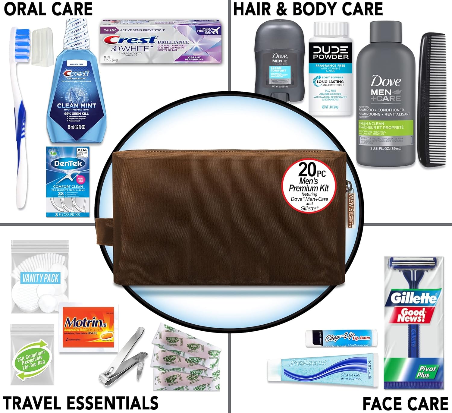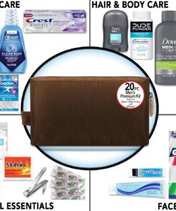 Convenience Kits International Men’s Premium 20-Piece Kit with Travel Size TSA Compliant Essentials, Featuring: Dove Men & Care Products in Brown Dopp Bag