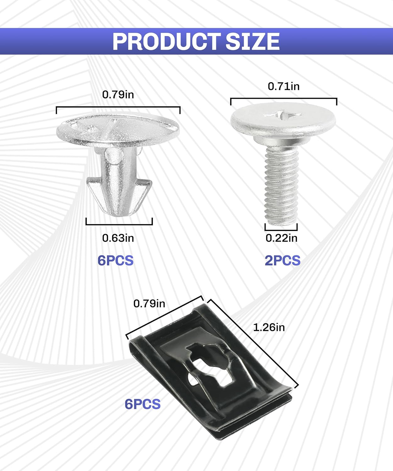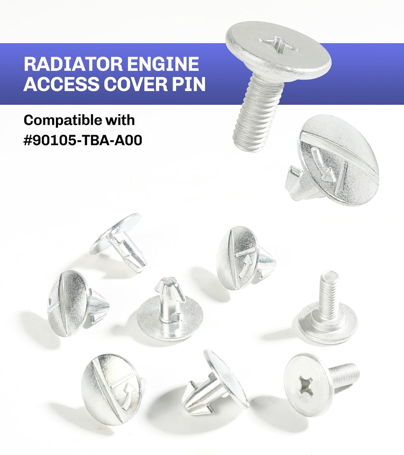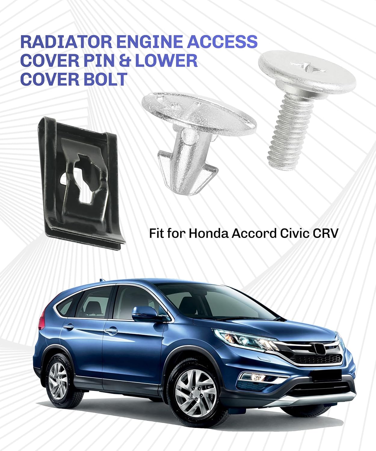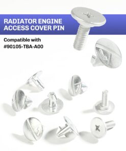 [Packing List] You will receive 6 pieces engine access cover pin for replacement, compatible with #90674-TY2-A01, 2 pieces lower cover bolt for replacement, compatible with #90105-TBA-A00,and 6 pieces of radiator engine access cover pin clips.[High Quality Materials] Made of high quality metal materials, good reliability, strong and durable, stable characteristics, long term use.[Easy to Use] The fastener clips and engine access cover pins are used to secure engine oil drain plug access cover to its mounting point firmly fits perfectly into your car and is an ideal replacement for the original equipment.[Essential Tools] These splash guard hardware screws are perfectly matched to replace damaged or missing retainers. Get them and leave the hood to drag. They can extend the service life of car engines.[Note] Please check the size of the corresponding parts model of your car before purchasing, so as not to cause an unpleasant shopping experience.