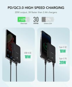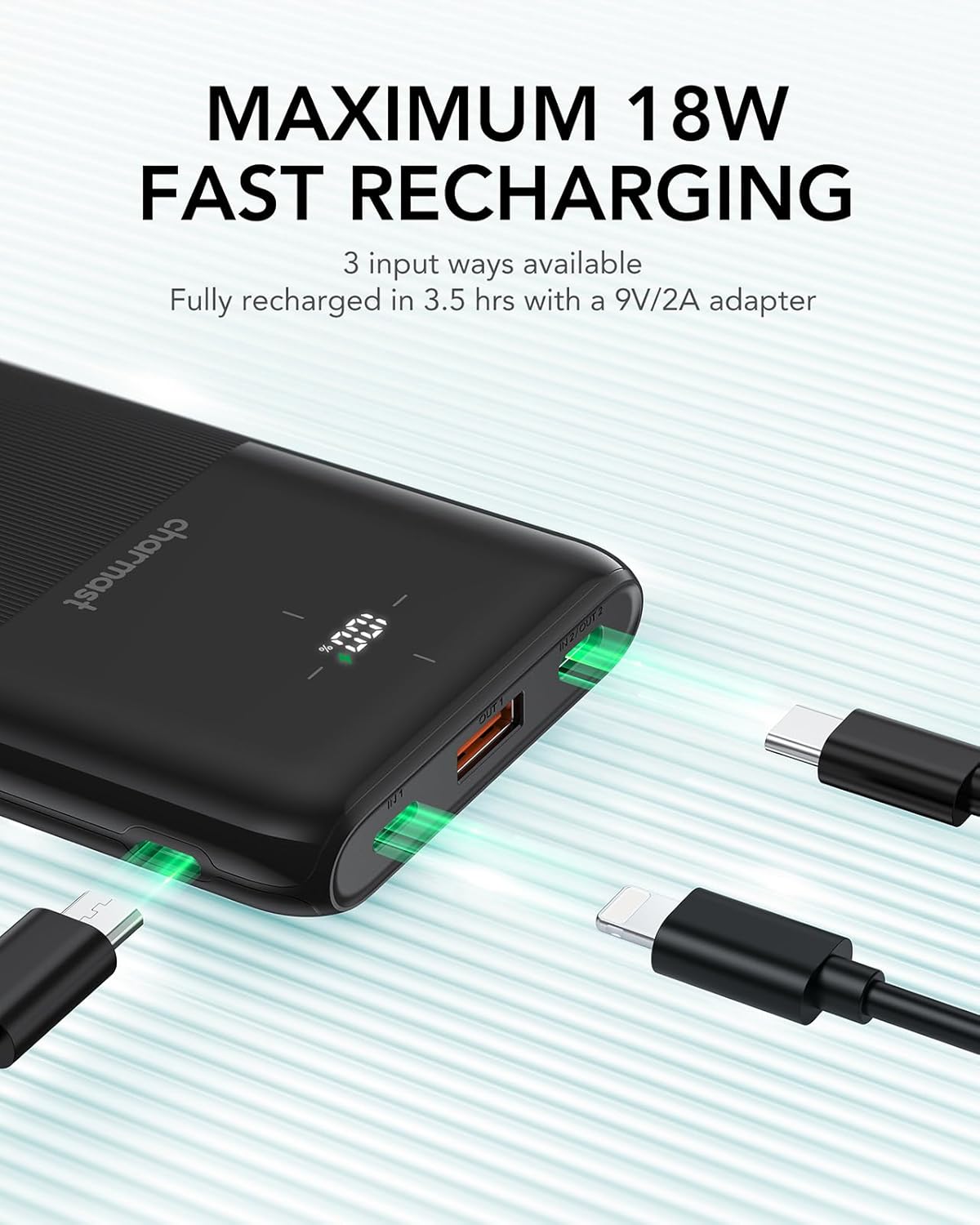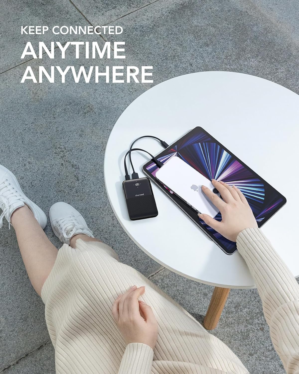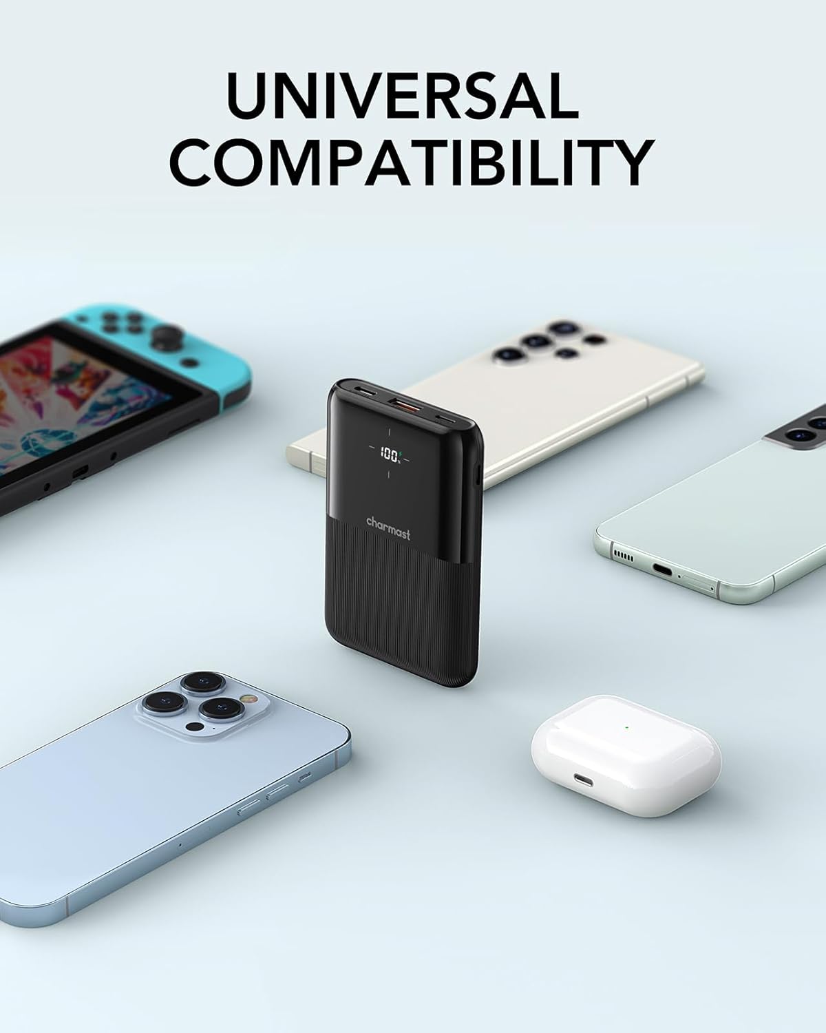 🔋Ultra-Compact Design: Charmast Small Portable Charger packs a powerful 10000mAh capacity into a sleek body measuring only 3.95″ x 2.63″ x 0.68″ and weighing just 5.85oz. Its compact size effortlessly fits into your pocket or bag, making it the perfect travel companion without adding any extra weight.