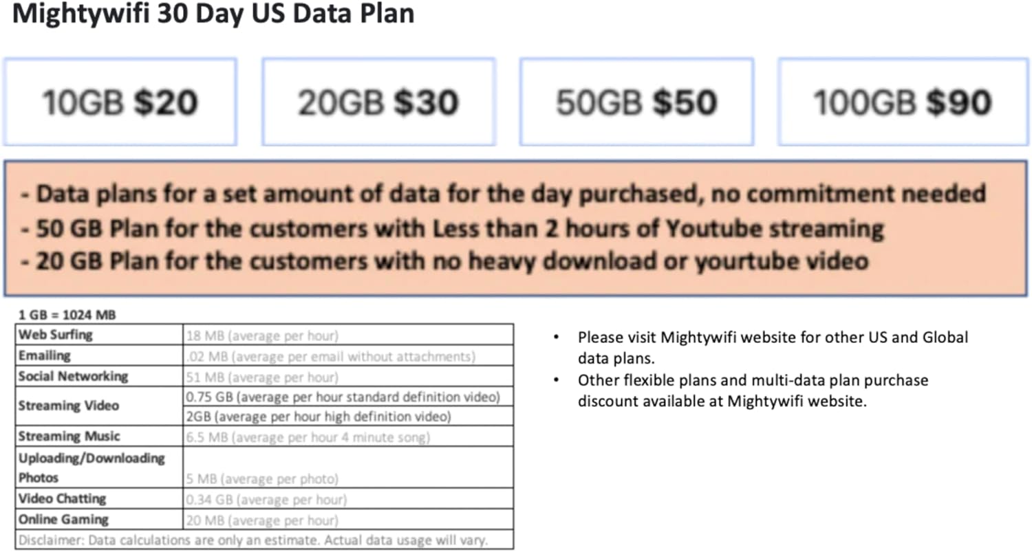 【Exclusive app and data package 】 You can manage and buy more data in our data store quickly and easily. After you use up the data package, just download Mightywifi Cloud App from from “APPLE STORE” or “GOOGLE PLAY STORE” for access. . Download it to keep track of your data usage and instant recharge while you’re on the move! No contract or extra roaming charges.