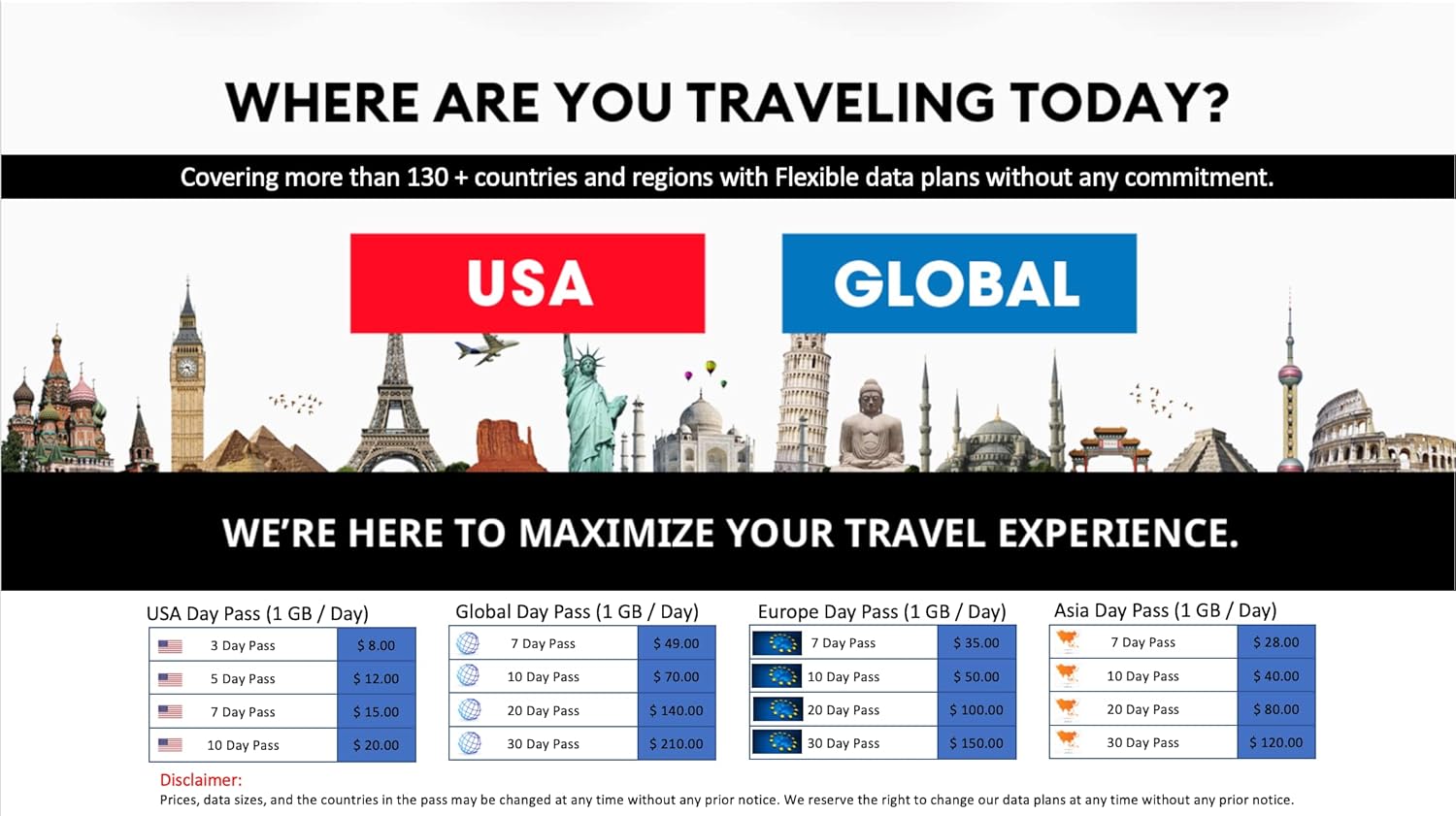【Flexible and Low Cost Global Data Plan – 1 GB/30 Day Data Plan】 Australia $4, France $2, Germany $2, Hong Kong $6, Italy $2, Japan $2, South Korea $3, Macau $6, Morocco $3, Taiwan $5, Thailand $3, United Kingdom $2. Please check the website for other countries and additional data plans. * Global Plan does not include all countries and please check the site for the list of countries covered.