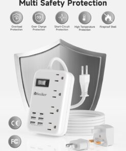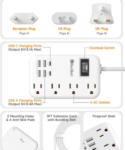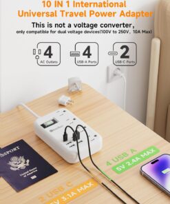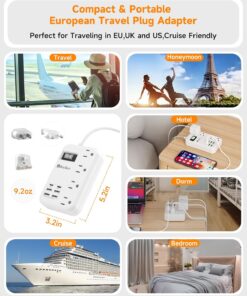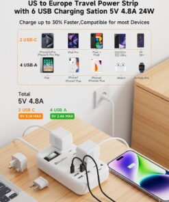 【6 USB Ports 4 AC Outlets&3 FT Cord】-The USB C universal travel adapter features 4 AC widely spaced outlets,and 4 USB-A 2 USB-C ports (5V/4.8A/24W in total), could charge 10 devices simultaneously.US to Europe plug adapter with 3ft extension cord would charge your cellphone,tablet,kindle,cameras,lamps, power bank, headphone etc while traveling,suitable for travel,cruise,home,office and dorm room.(NOTE:Not a Voltage Converter)
