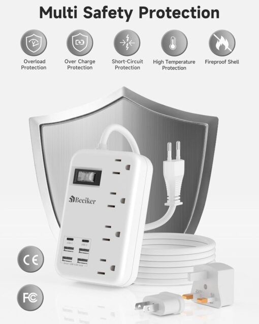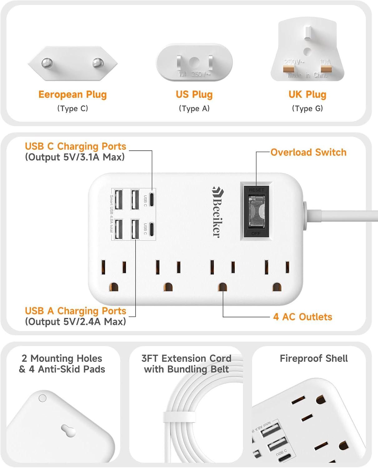 【International Travel Power Adapter/Power Strip(more than 150 countries and regions)】Includes 3 types of international plug adapters -Type C(EU),Type G(UK),Type A(USA) plugs compatible with most of the world. Type A plug adapter can work in America,Japan,Canada,China.Type C European travel plug adapter can work in France Italy Germany and most of Europe. Type G plug adapter can work in UK,Ireland,Middle East.It is not only a travel essentials,but also a power strip for home/office
