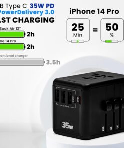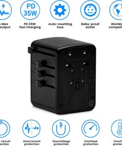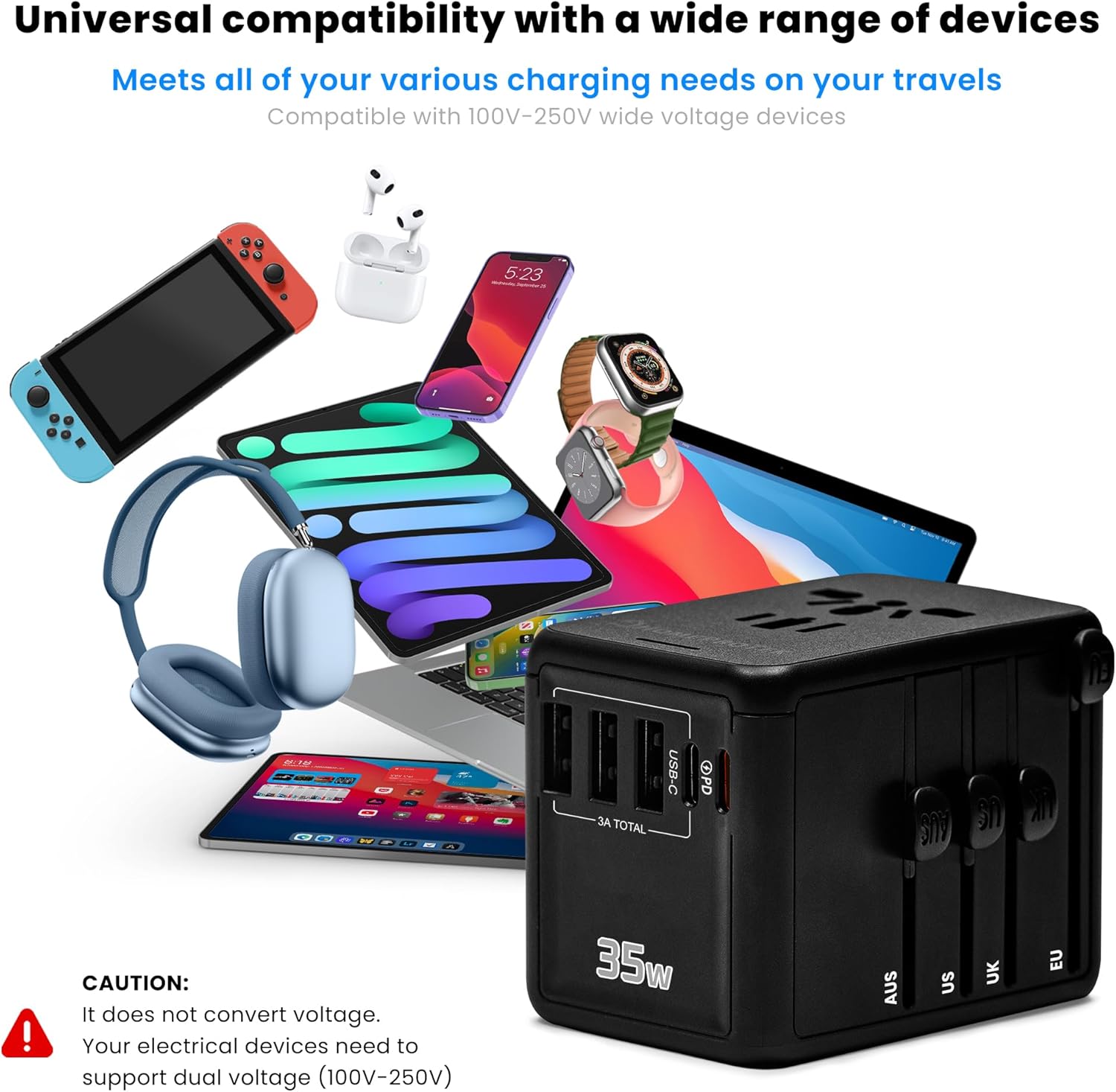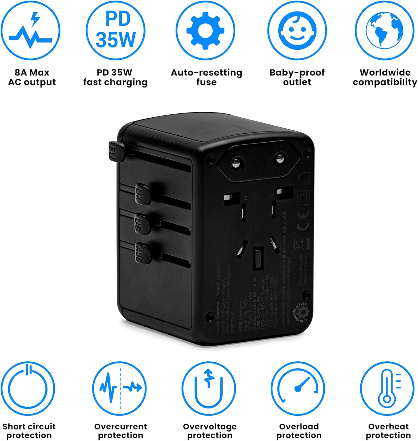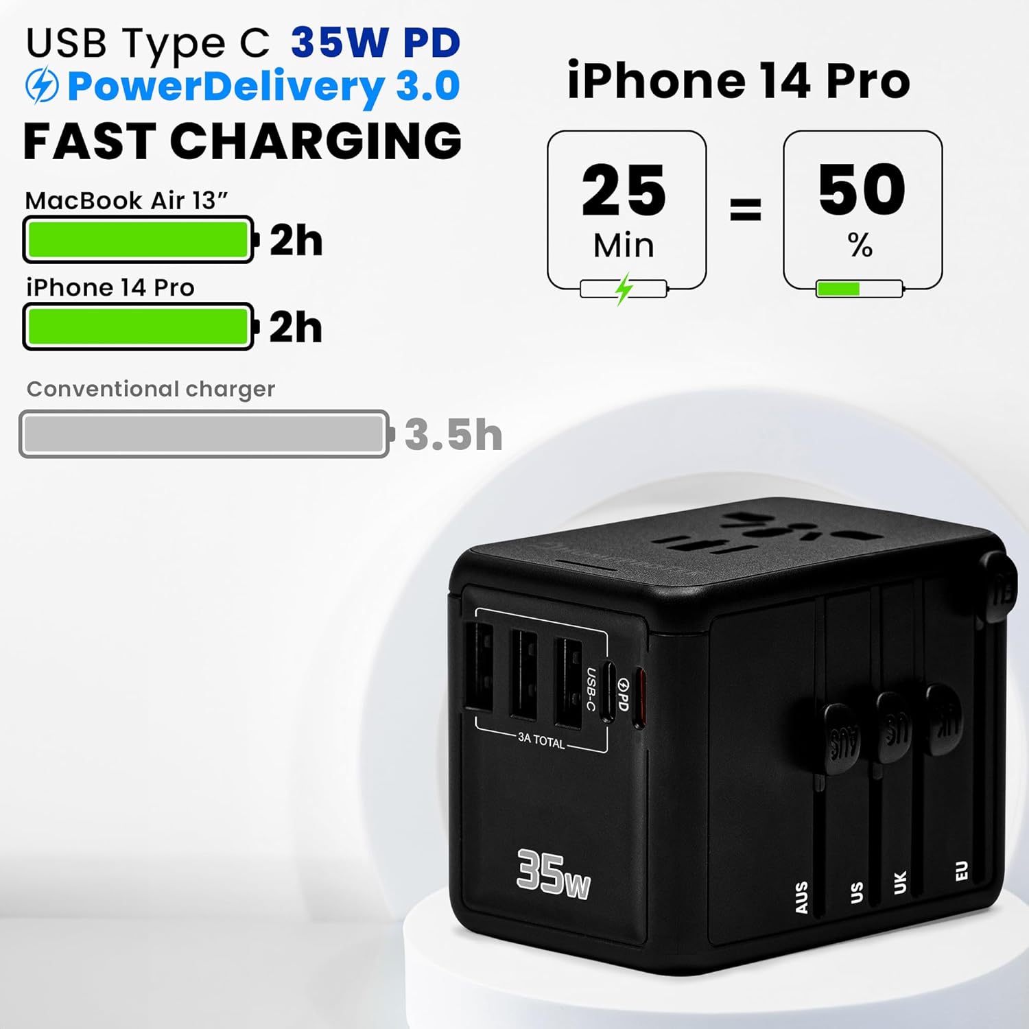 6in1 Universal Adapter – With our travel charger you can simultaneously charge up to 6 devices. It has 3 USB-A ports, a USB Type-C port and a USB Type-C PD 35W fast charging port. It is the perfect combination for charging you iPhones, Laptops, Tablets, Smart Watches, Cameras, Power Banks, Headsets and more.