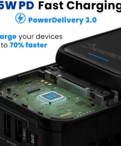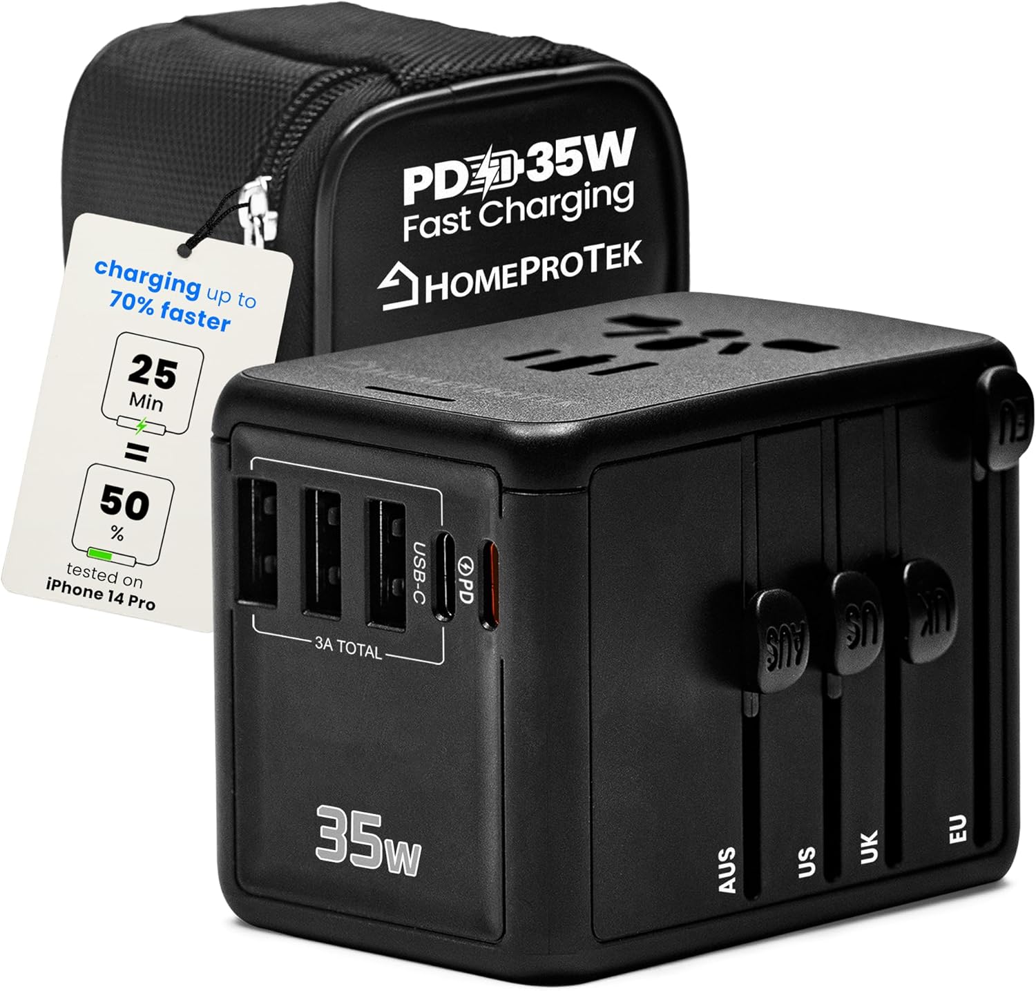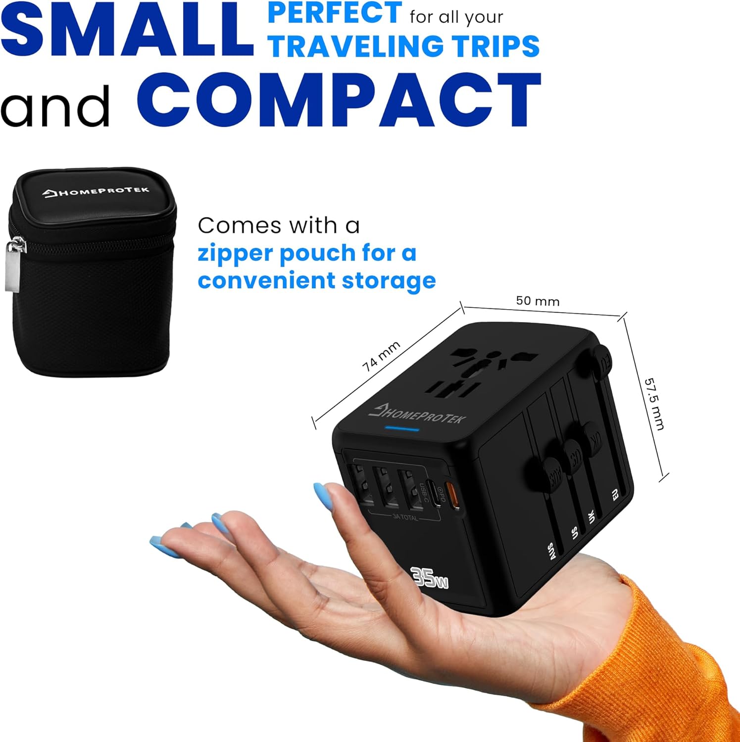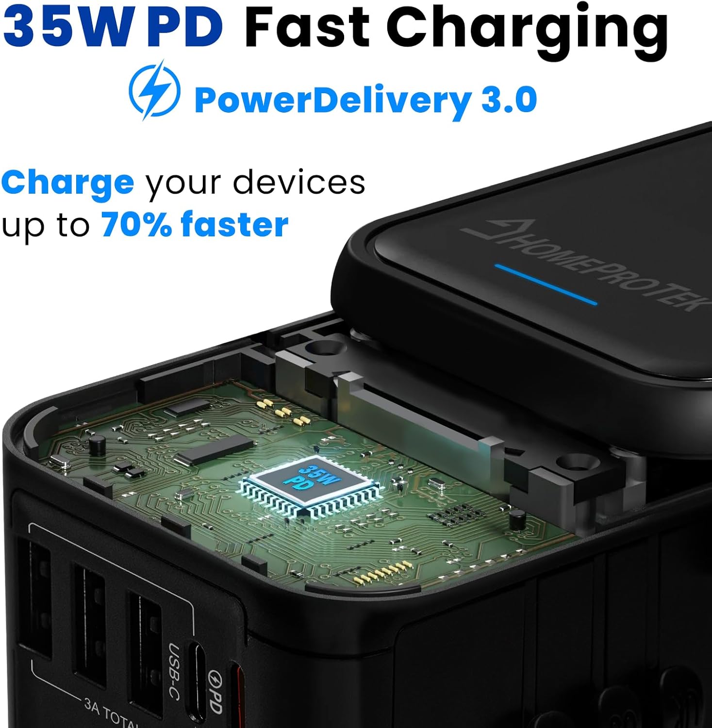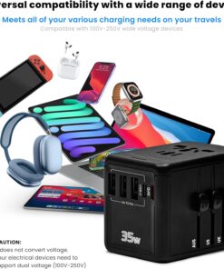 6in1 Universal Adapter – With our travel charger you can simultaneously charge up to 6 devices. It has 3 USB-A ports, a USB Type-C port and a USB Type-C PD 35W fast charging port. It is the perfect combination for charging you iPhones, Laptops, Tablets, Smart Watches, Cameras, Power Banks, Headsets and more.