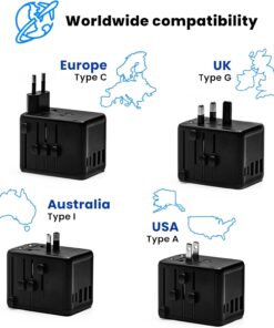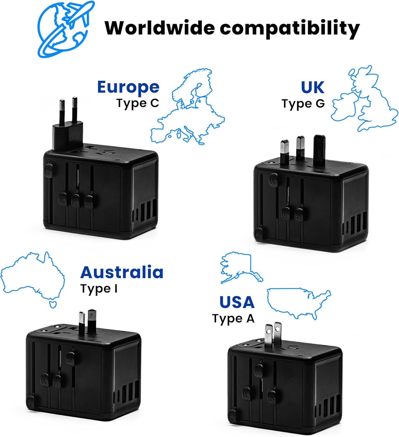 International Power Adapter – Our all-in-one universal power adapter comes with 4 different plugs (EU, UK, US and AUS) and it can be used in more than 150 countries worldwide (USA, UK, Canada, Ireland, Scotland, France, Italy, Spain, Germany, New Zealand, Australia, Argentina, Brazil, Japan, Thailand, China and many more). It is one of those travel essentials you must have on your every trip.