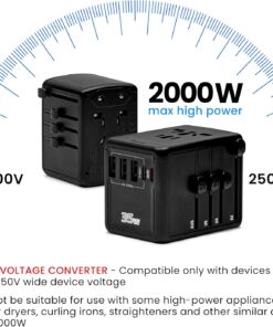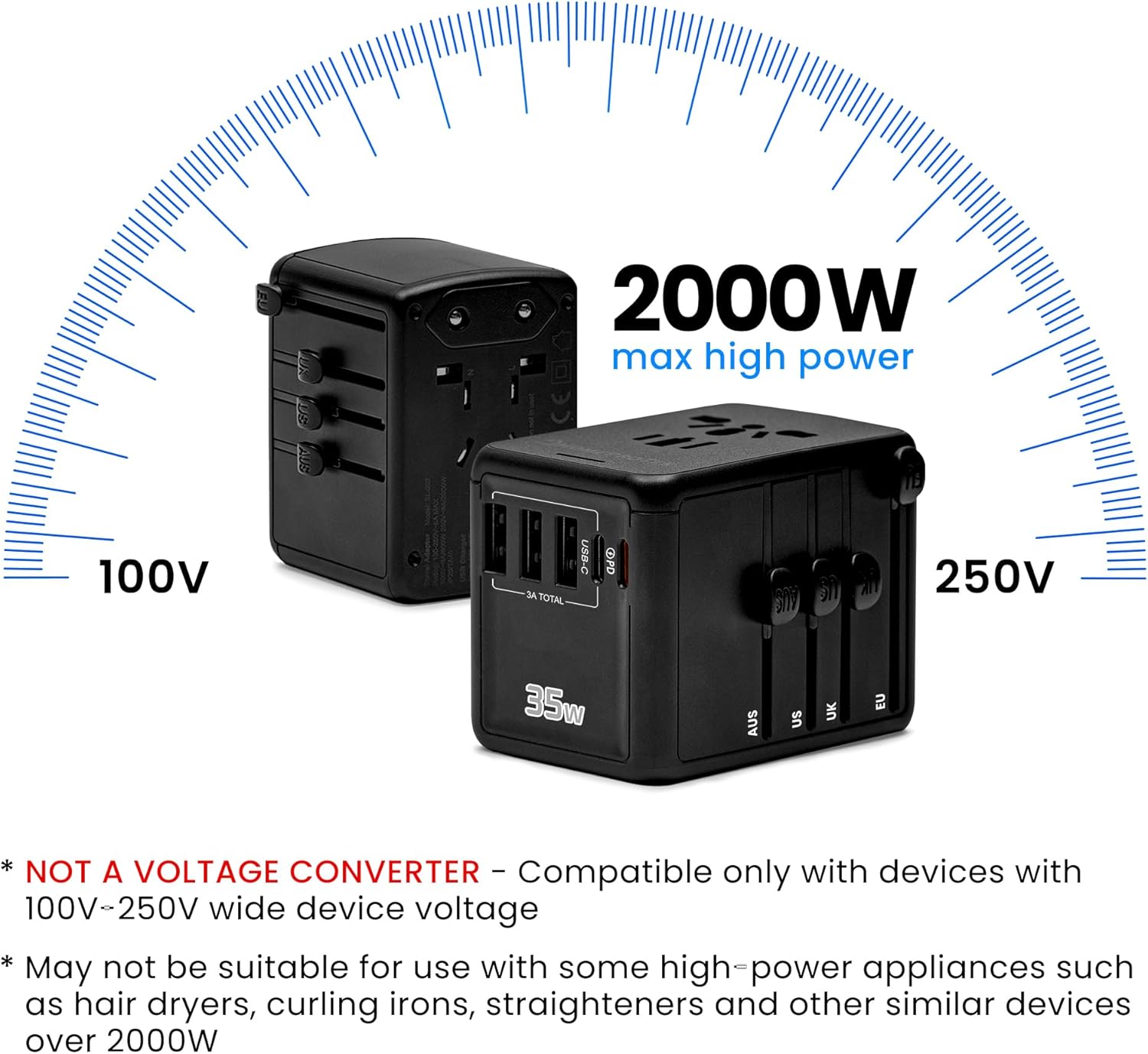 It is NOT A VOLTAGE CONVERTER – The travel adapter does not convert voltage and may not be suitable for use with some high-power appliances such as hair dryers, curling irons, straighteners and other similar devices over 2000W. Please check if your device is rated under 8A. Dual voltage design with Max Power: 100V~8A/800W, 250V~8A/2000W, 50/60Hz.