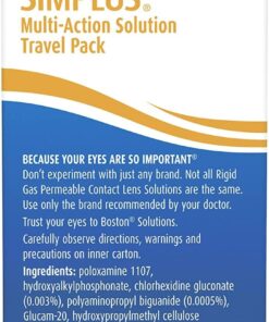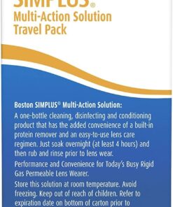 Boston SIMPLUS Multi-Action Solution is a one-bottle, daily rigid gas permeable contact lens care system that cleans, removes proteins, rinses, disinfects and conditions. Eliminates loosened surface deposits. Helps keep stubborn deposits away from lenses. Effectively destroys harmful micro-organisms. Carry-On Size! Contents: 1 Fl. Oz. Boston Simplus Multi-Action Solution; Lens Case.