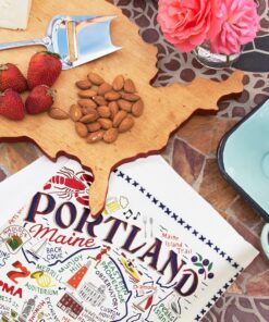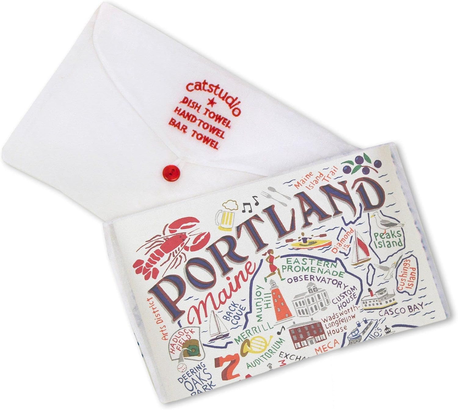 PORTLAND tea towel is a must have kitchen essential for any traveler. Our original design features the famous landmarks from all around Portland, from Diamond Island to Commercial Street. Whether looking for Maine souvenirs, Maine gifts, or the perfect souvenir for commemorating an anniversary or trip, our decorative tea towels are sure to delight.
