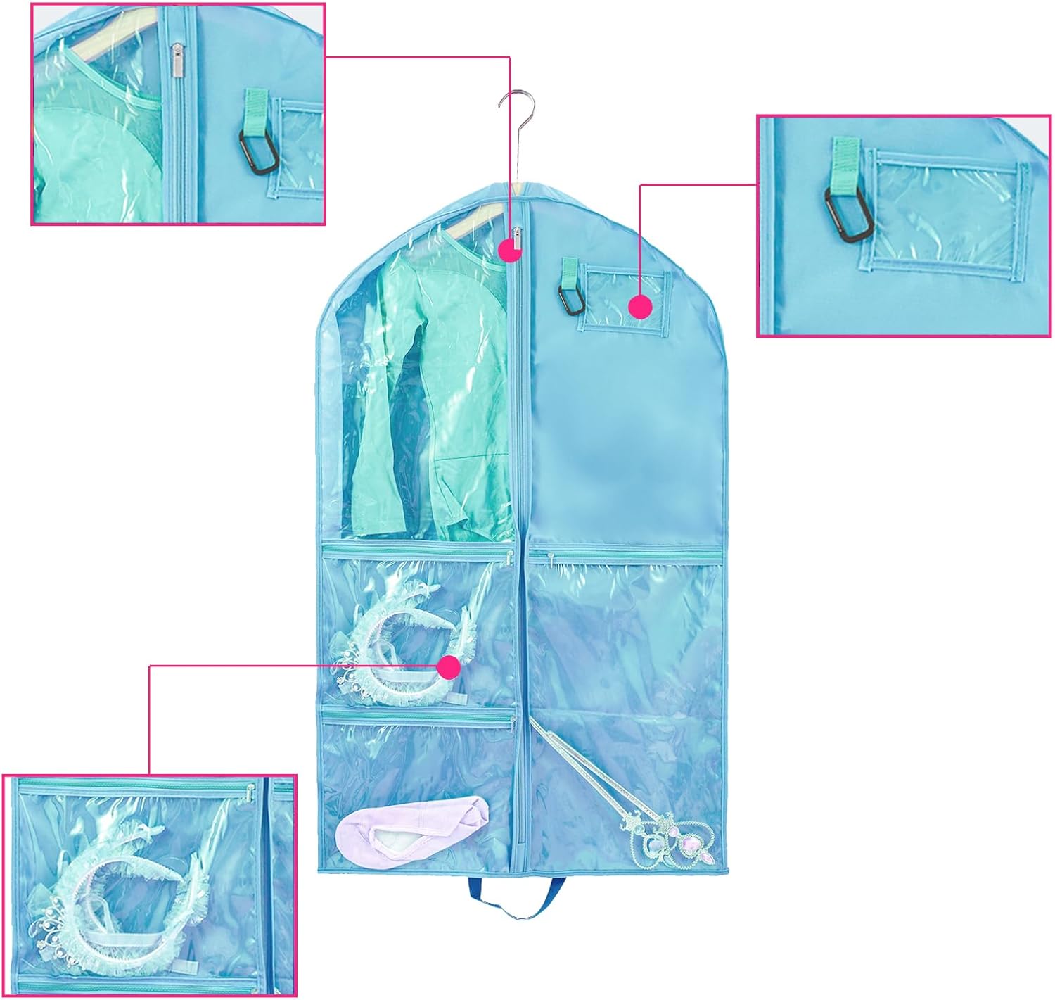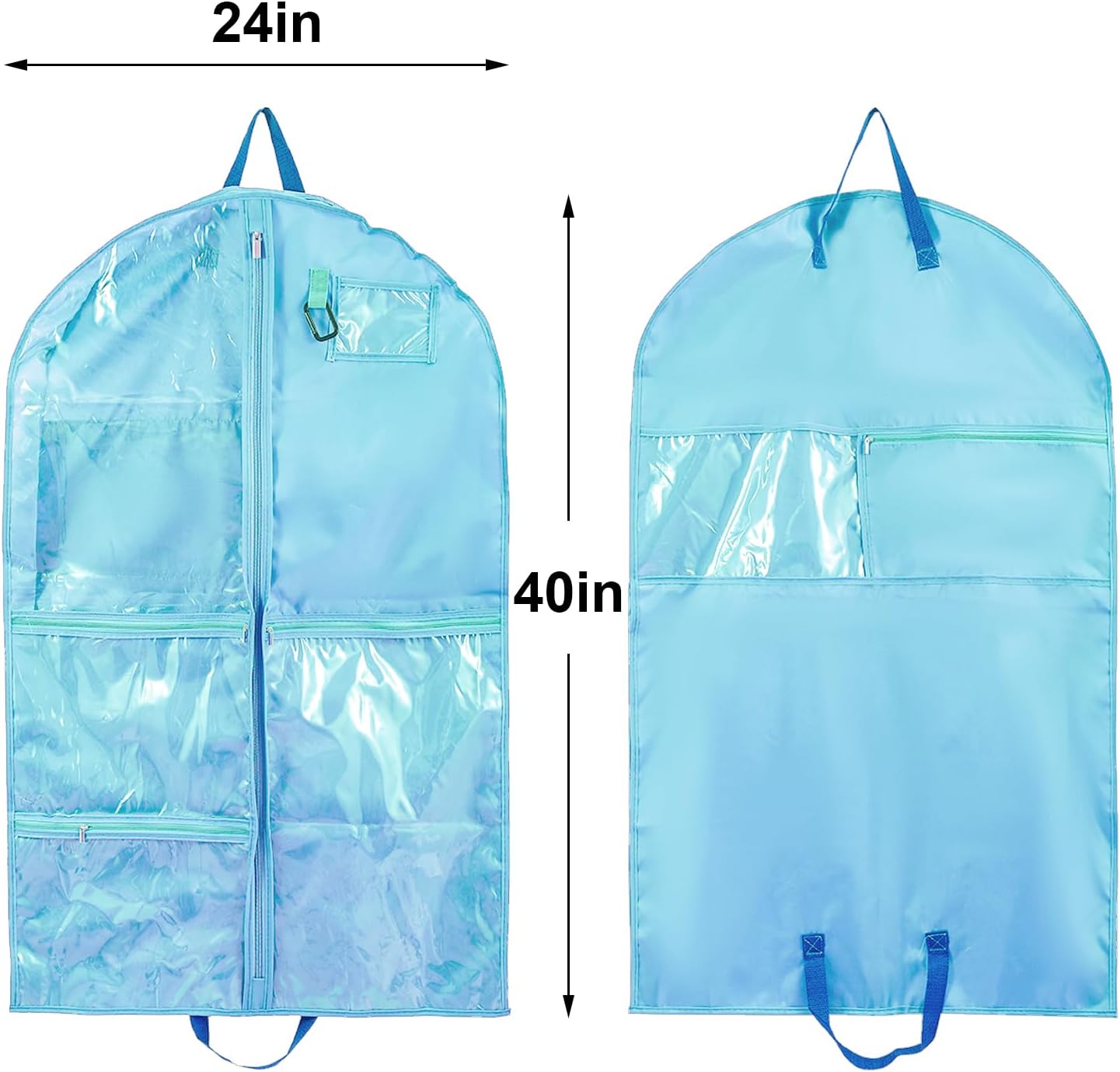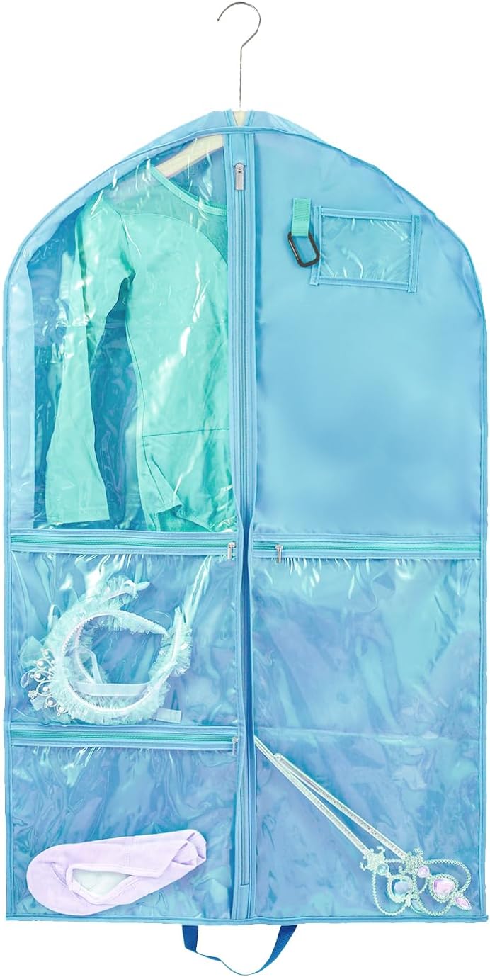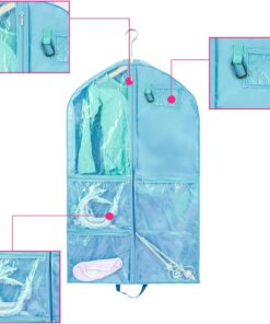 🌺Garment Bags for Dance with Full Zipper & Multiple Zip Pockets: Garment bags are with sturdy full zippers to make your event smooth and stress-free. 3 large clear zipper pockets separately storing your shoes and accessories,such as belts, glasses, tiaras, small wands socks, hair ties, makeup box, dance shoe etc. A PVC ID card holder of the dance garment bag for name tag or identification Card. Ideal to put in wardrobe, storage or being carried while traveling.