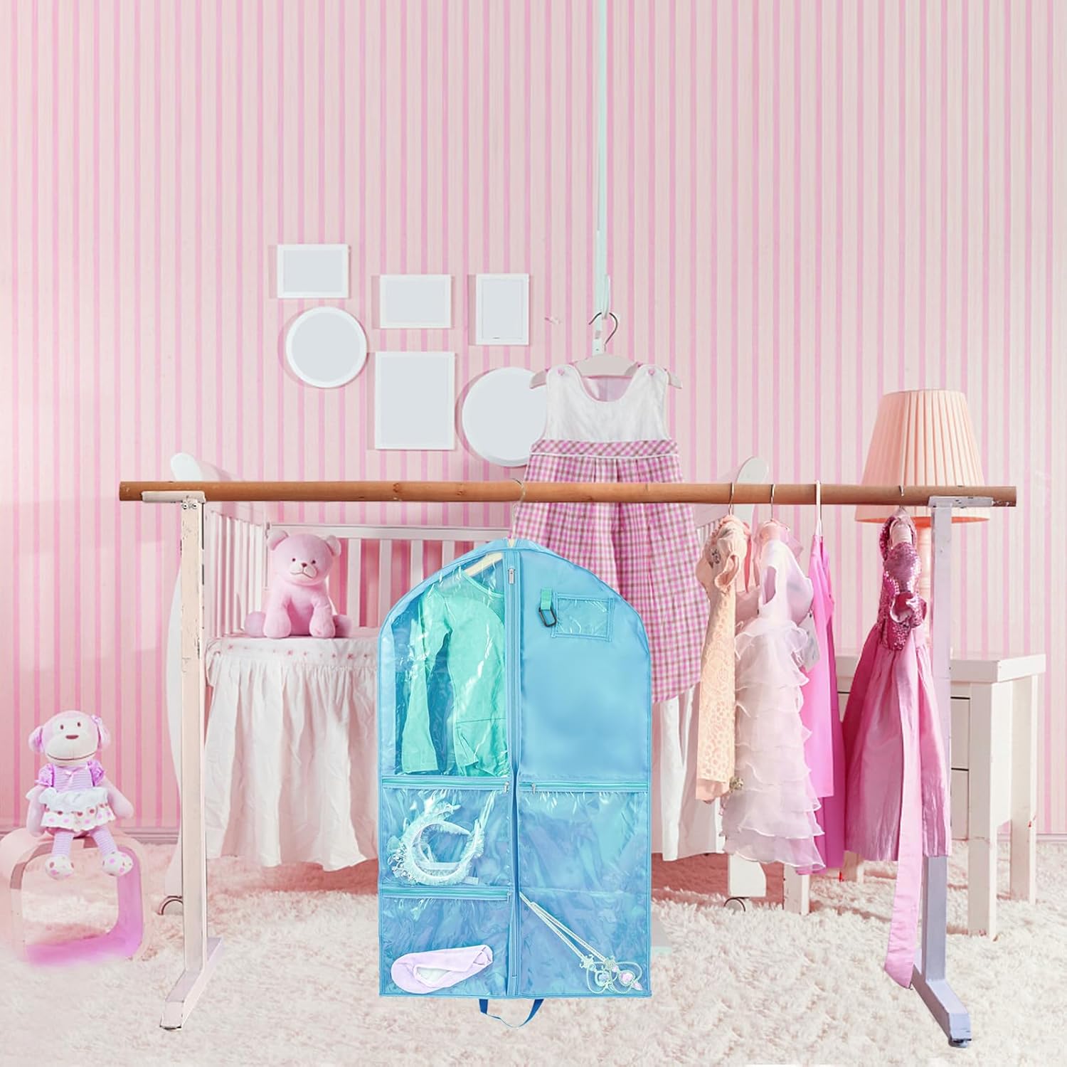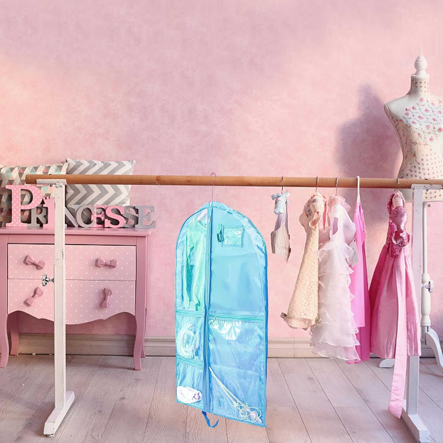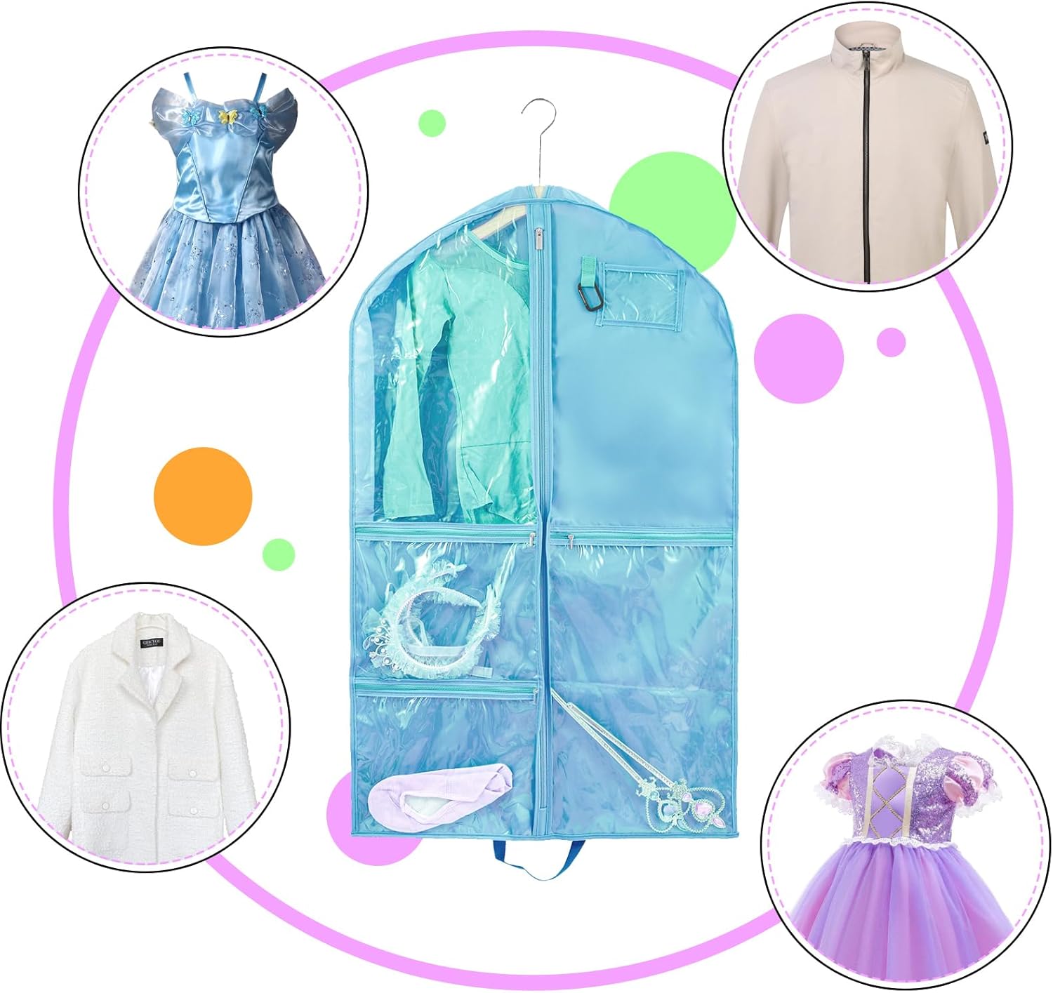 🌺Garment Bags for Dance with Full Zipper & Multiple Zip Pockets: Garment bags are with sturdy full zippers to make your event smooth and stress-free. 3 large clear zipper pockets separately storing your shoes and accessories,such as belts, glasses, tiaras, small wands socks, hair ties, makeup box, dance shoe etc. A PVC ID card holder of the dance garment bag for name tag or identification Card. Ideal to put in wardrobe, storage or being carried while traveling.