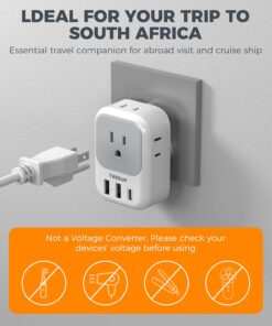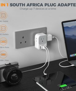7 in 1 Type M Plug Adapter: This Africa power adapter can turn 1 South Africa Type M socket into 4 American AC outlets and 3 USB ports; 4-side design can charge 7 devices at a time without blocking, ideal to use in airports, hotels and dormitories