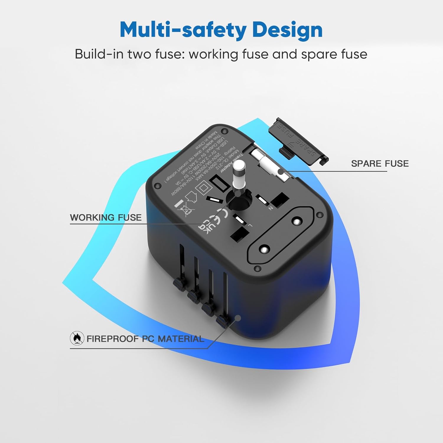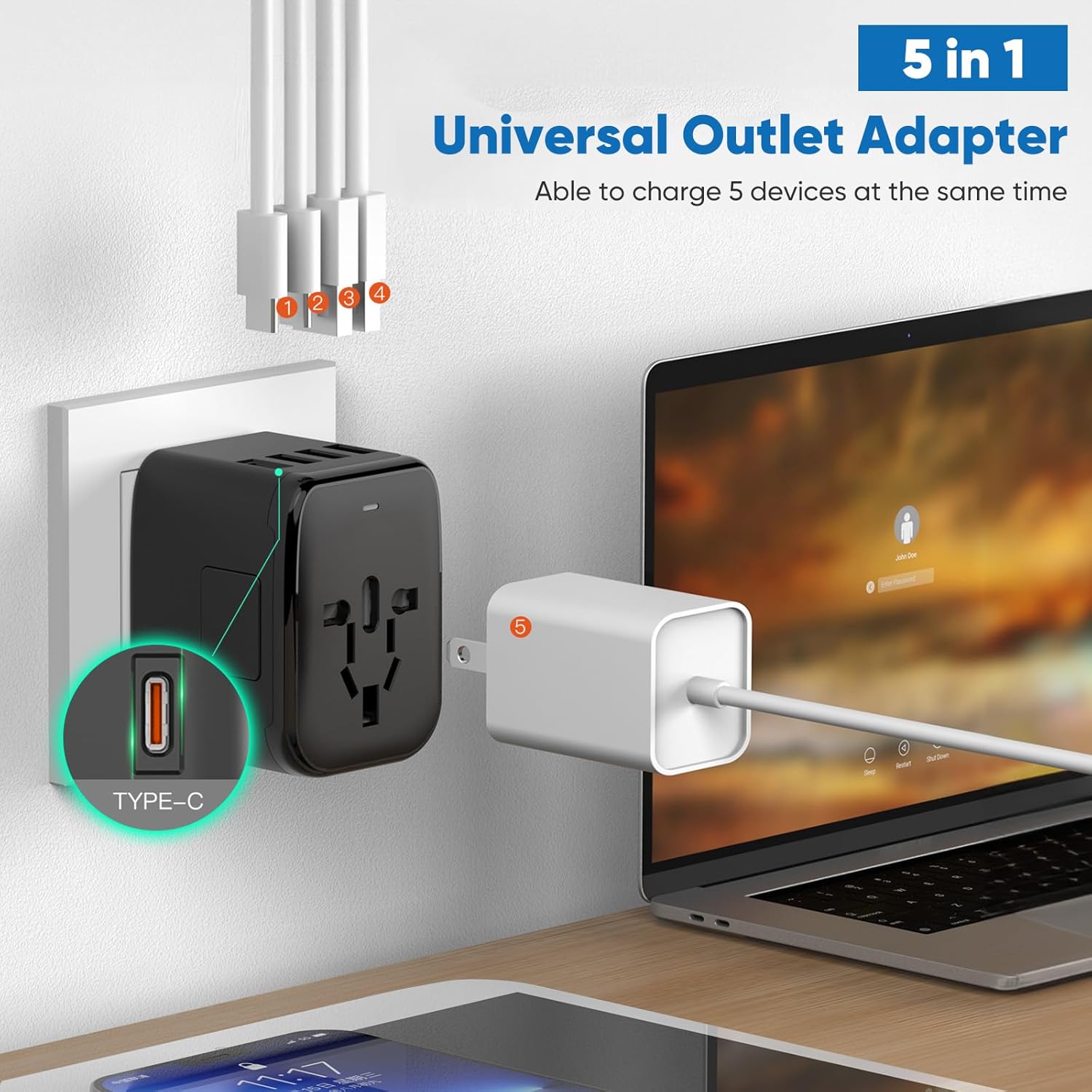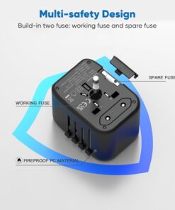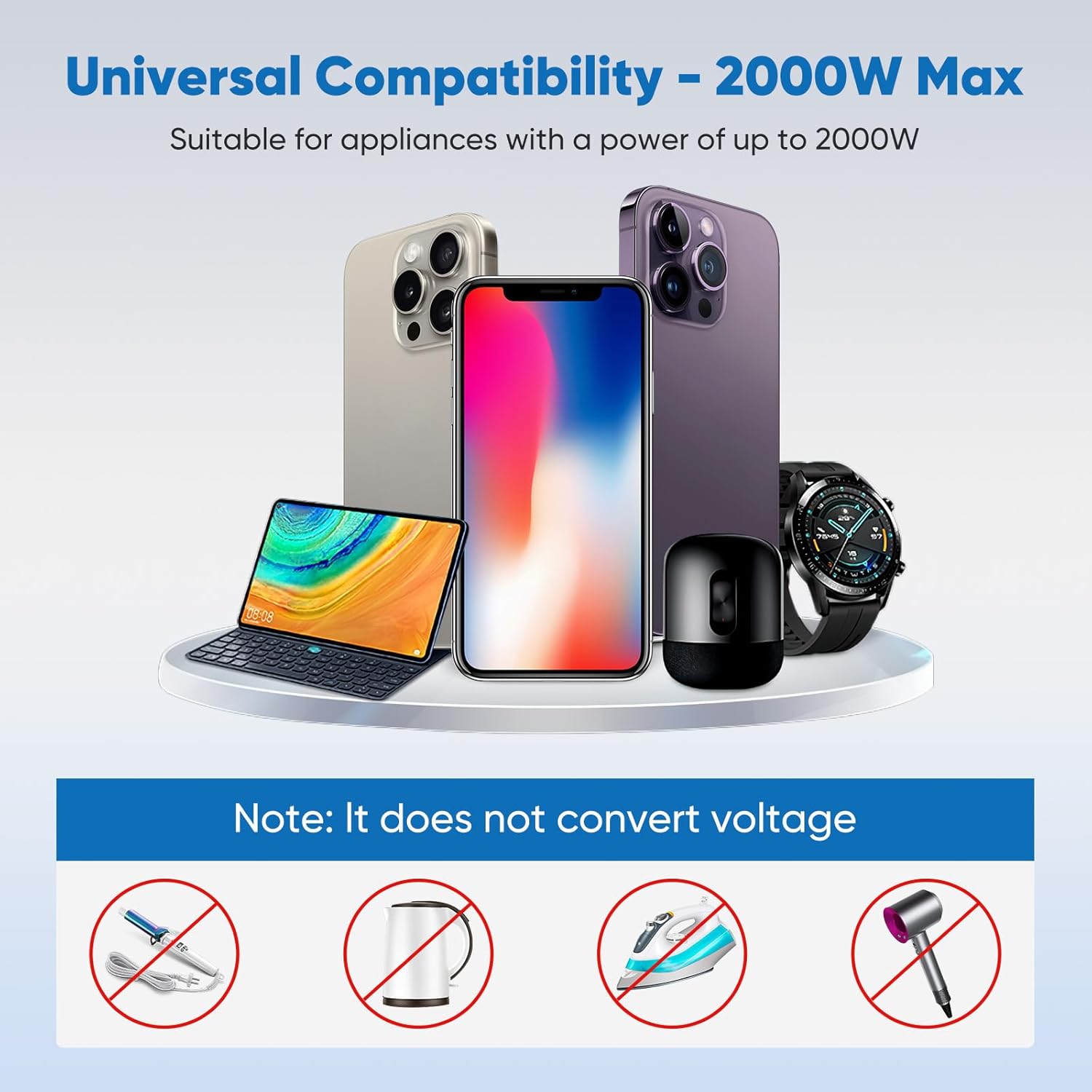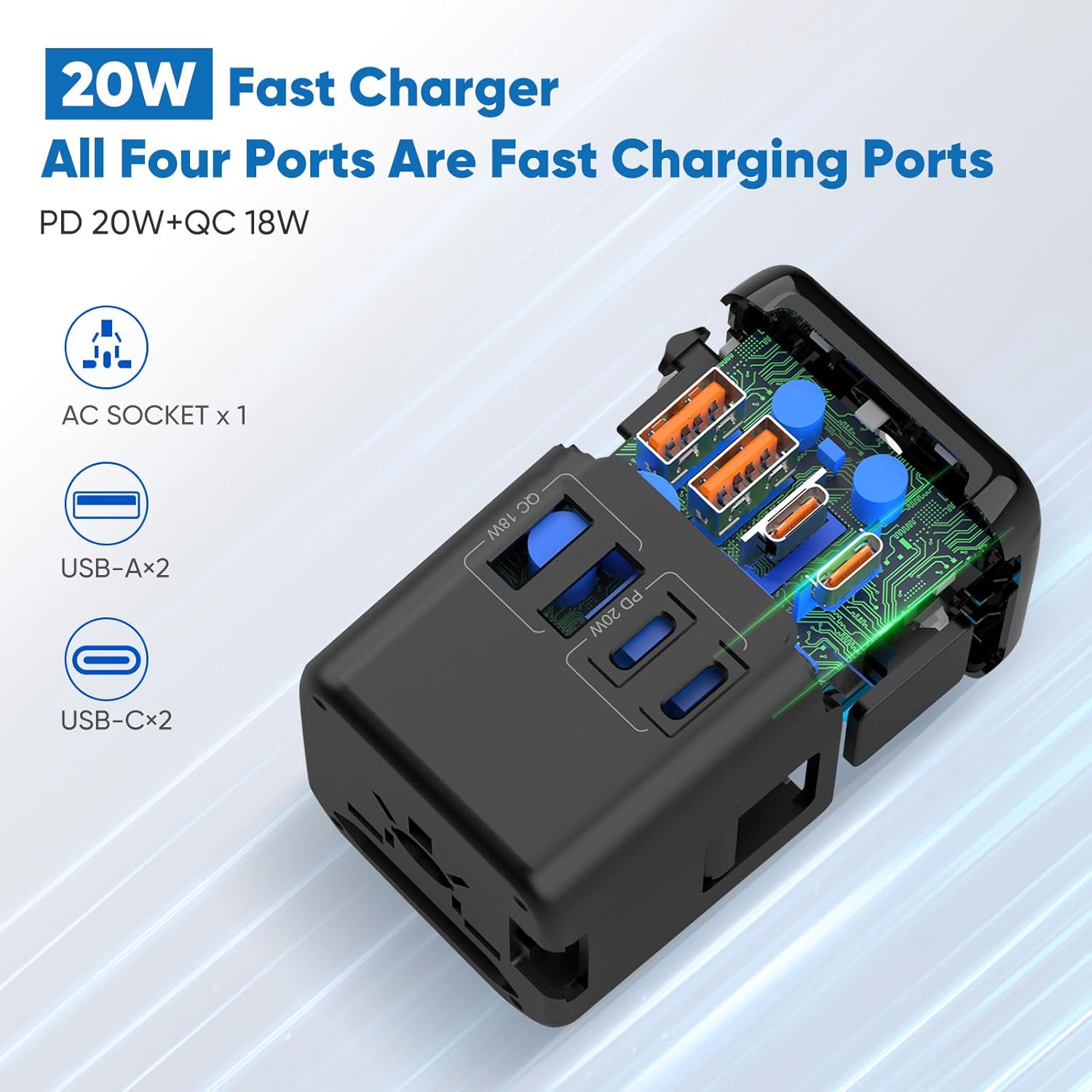 Compatible with 200+ countries and regions,a must-have when travellingSupports simultaneous fast charging of five devices: 2 usb-A, 2 usb-C, 1 ACWith GaN technology,all four ports are fast-flush connectors,supports PD20W, QC18WWide voltage design with double fuse,Ensure safe use of the adapterChild safety door, fireproof material, double-sided PCBA circuit board, intelligent chip, all-round protection for your useNOTE : Is not a voltage converter, please make sure your device is less than 2000W