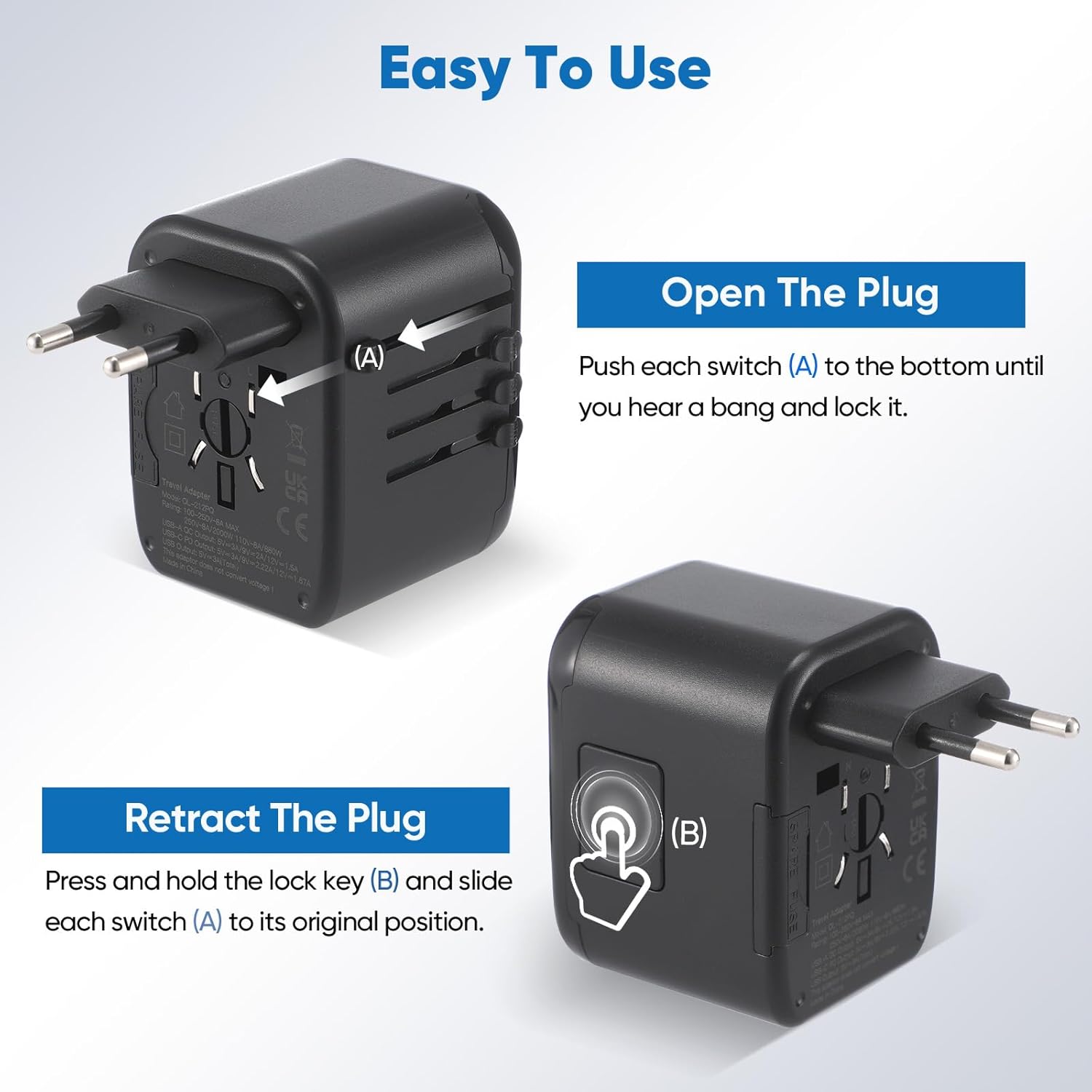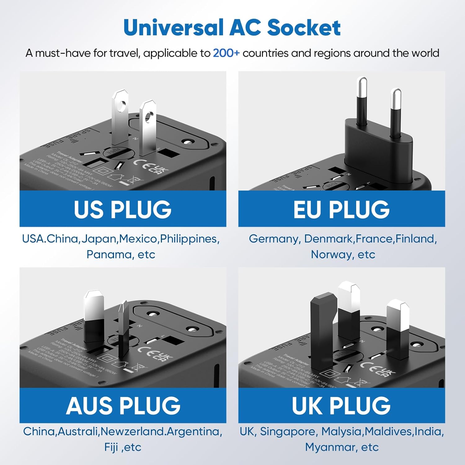 [Travel Essentials International Travel Adapter]:UNILLQSS european travel plug adapter is equipped with 4 different plug types,cover more than 200 countries and regions,suitable for most of Europe,including France,Germany,Italy,Spain,Iceland,Greece,as well as for the UK Ireland England USA,Australia,China and other countries, making them as travel must haves[2 USB-C And 2 USB-A Fast Charging Ports Adapter Plug Converter]:UNILLQSS international plug adapter with GaN fast charging technology,USB-C ports support PD20W and USB-A ports support QC18W,high speed charging of multiple devices at the same time.Compatible with all usb devices such as iPhone,Samsung,Huawei and other Android phones,smart watches, tablets, handheld gaming consoles,headphones etc[AC 2000W Max Travel Plug Adapter]:Global 5 in 1 AC outlet Adaptor with 100V-250V wide voltage design that converts US,EU,UK and Australian plugs,you can plug electronics from different countries into this outlet.Maximum capacity up to 2000W[Compact and Portable Traveling Adapter]:The lightweight design make the european plug adapter suitable for carrying in luggage and backpacks.As a universal power adapter,it is made of fireproof pc housing and selected phosphor bronze.This plug adapter has a built-in 8A ceramic explosion-proof fuse and safety gate to ensure that you and your equipment are fully protected[Important Notes] UNILLQSS worldwide travel adapter is not a voltage converter. It is only compatible with devices with power less than 2000W. Before you use this product, please make sure your device is less than 2000W.For those who love to travel around the world, our UNILLQSS charger is the perfect gift