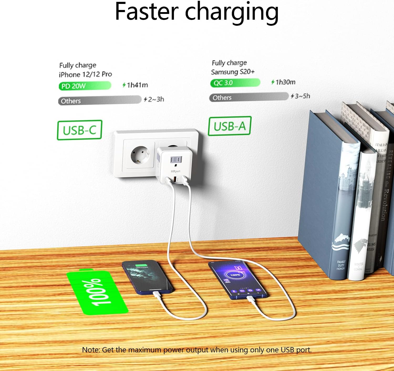 6-in-1 Plug Adapter: This UK plug converter takes up one uk socket, expands it into 3 US sockets and 2 USB-A 1 USB-C port,allowing you charge 6 devices simultaneously.ideal for cell phone, tablet, power bank and other electrical chargers; compared to other versions, the 20W PD 3.0 and Quick Charge 3.0 ports offer faster and safer charging.